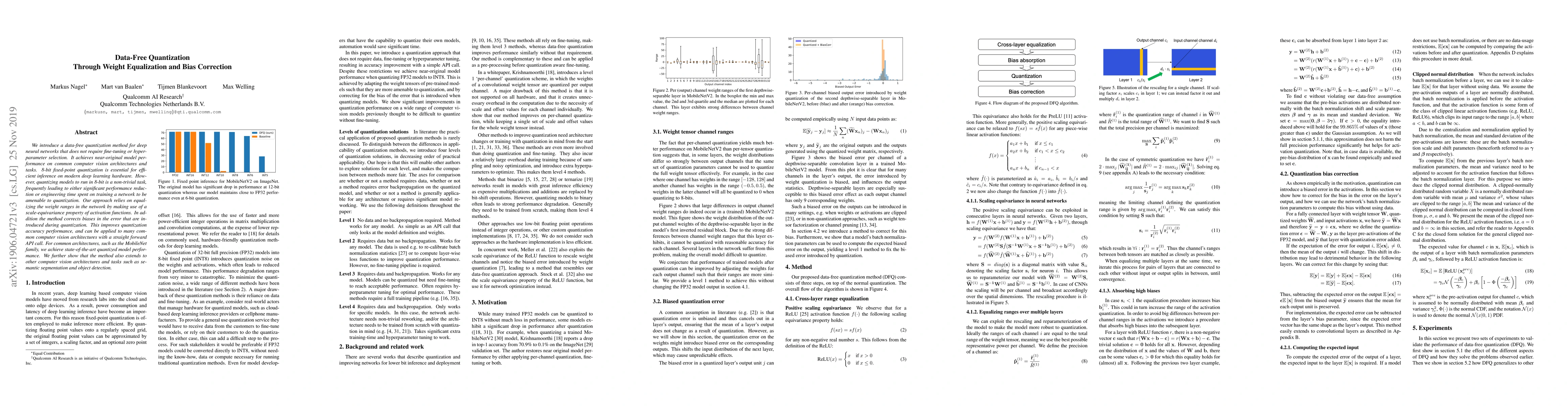 We introduce a data-free quantization method for deep neural networks that does not require fine-tuning or hyperparameter selection. It achieves near-original model performance on common computer vision architectures and tasks. 8-bit fixed-point quantization is essential for efficient inference on modern deep learning hardware. However, quantizing models to run in 8-bit is a non-trivial task, frequently leading to either significant performance reduction or engineering time spent on training a network to be amenable to quantization. Our approach relies on equalizing the weight ranges in the network by making use of a scale-equivariance property of activation functions. In addition the method corrects biases in the error that are introduced during quantization. This improves quantization accuracy performance, and can be applied to many common computer vision architectures with a straight forward API call. For common architectures, such as the MobileNet family, we achieve state-of-the-art quantized model performance. We further show that the method also extends to other computer vision architectures and tasks such as semantic segmentation and object detection.