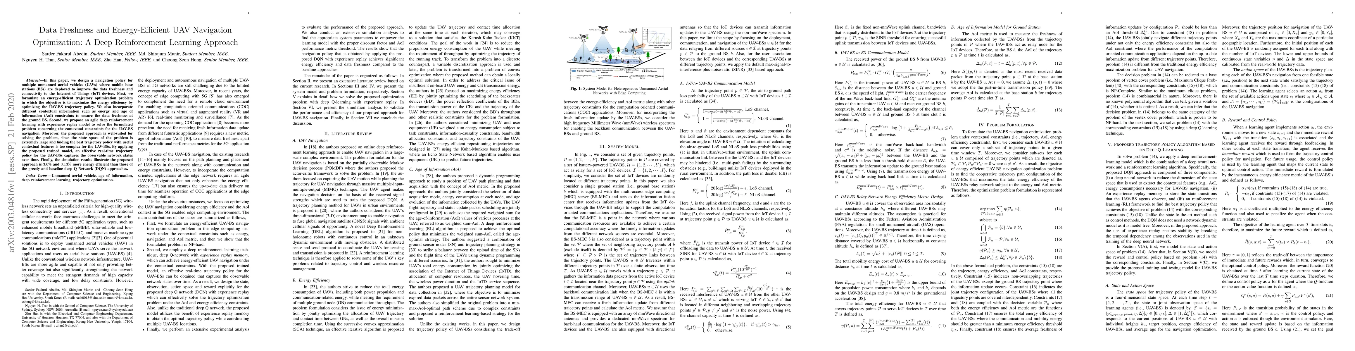 This paper proposes a deep reinforcement learning approach for optimizing the energy efficiency of UAV navigation in mobile base stations to enhance data freshness for IoT devices. The method effectively solves complex trajectory optimization problems by incorporating contextual constraints and outperforms greedy and DQN baselines by 3.6% and 3.13% in energy efficiency.