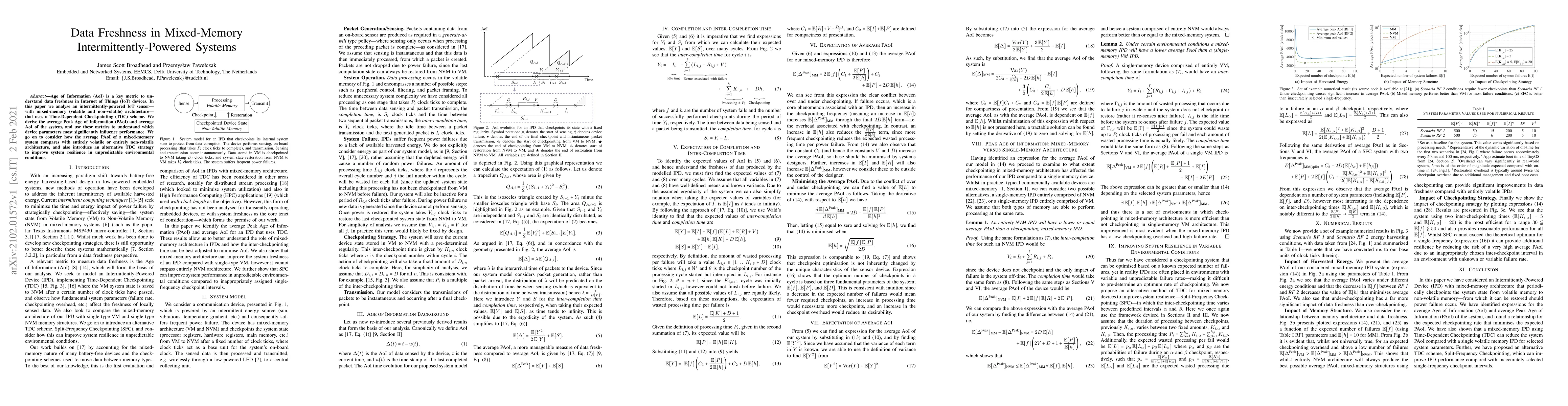 This paper analyzes an intermittently-powered IoT sensor with mixed-memory architecture, deriving metrics for average Peak Age of Information (PAoI) and average AoI to understand data freshness. It compares mixed-memory performance against purely volatile or non-volatile systems and proposes an alternative Time-Dependent Checkpointing strategy for better resilience.