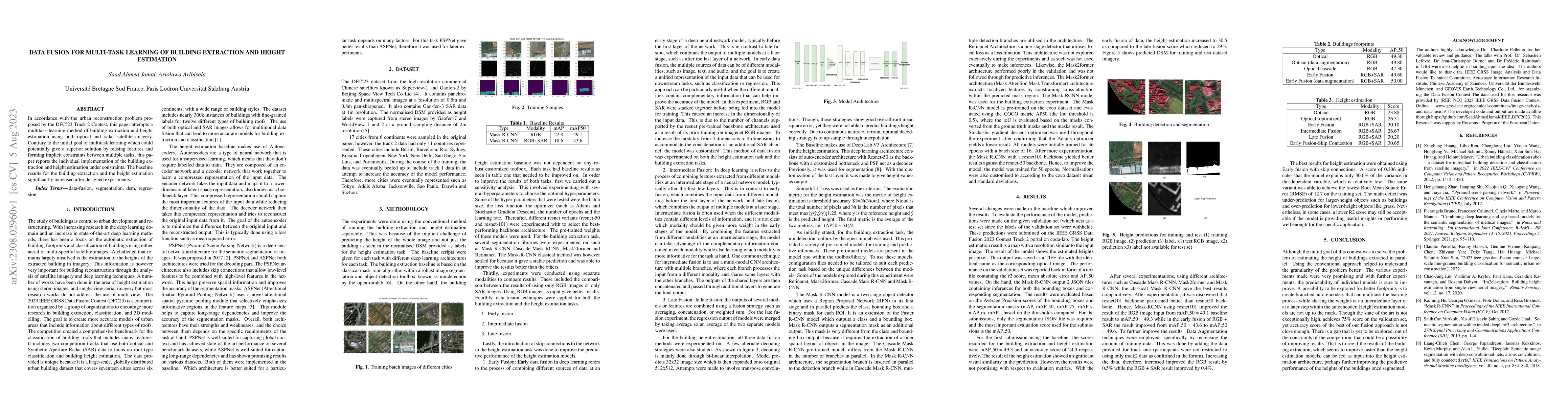 This paper proposes a multitask-learning approach to simultaneously extract buildings and estimate their heights using optical and radar satellite imagery, achieving improved baseline results. Despite the potential benefits of multitask learning, the study focuses on individual implementations under constraints.