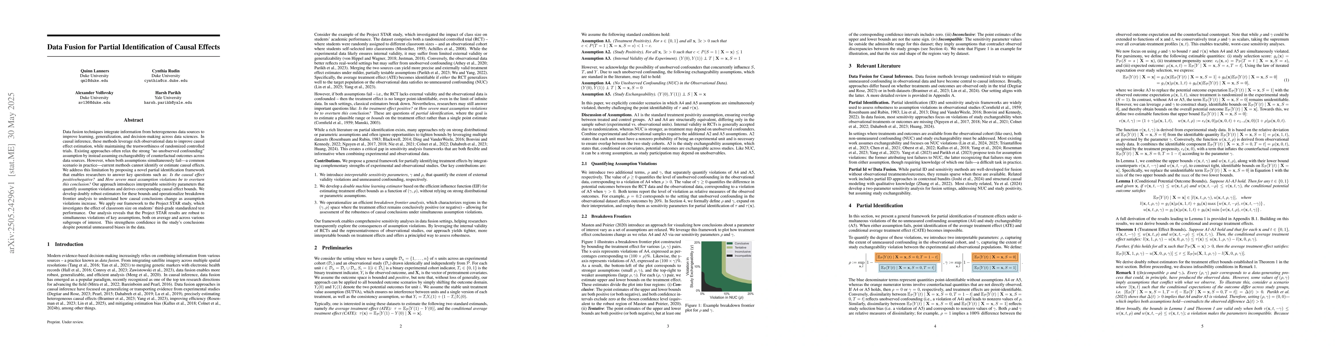 Data fusion techniques integrate information from heterogeneous data sources to improve learning, generalization, and decision making across data sciences. In causal inference, these methods leverage rich observational data to improve causal effect estimation, while maintaining the trustworthiness of randomized controlled trials. Existing approaches often relax the strong no unobserved confounding assumption by instead assuming exchangeability of counterfactual outcomes across data sources. However, when both assumptions simultaneously fail - a common scenario in practice - current methods cannot identify or estimate causal effects. We address this limitation by proposing a novel partial identification framework that enables researchers to answer key questions such as: Is the causal effect positive or negative? and How severe must assumption violations be to overturn this conclusion? Our approach introduces interpretable sensitivity parameters that quantify assumption violations and derives corresponding causal effect bounds. We develop doubly robust estimators for these bounds and operationalize breakdown frontier analysis to understand how causal conclusions change as assumption violations increase. We apply our framework to the Project STAR study, which investigates the effect of classroom size on students' third-grade standardized test performance. Our analysis reveals that the Project STAR results are robust to simultaneous violations of key assumptions, both on average and across various subgroups of interest. This strengthens confidence in the study's conclusions despite potential unmeasured biases in the data.
