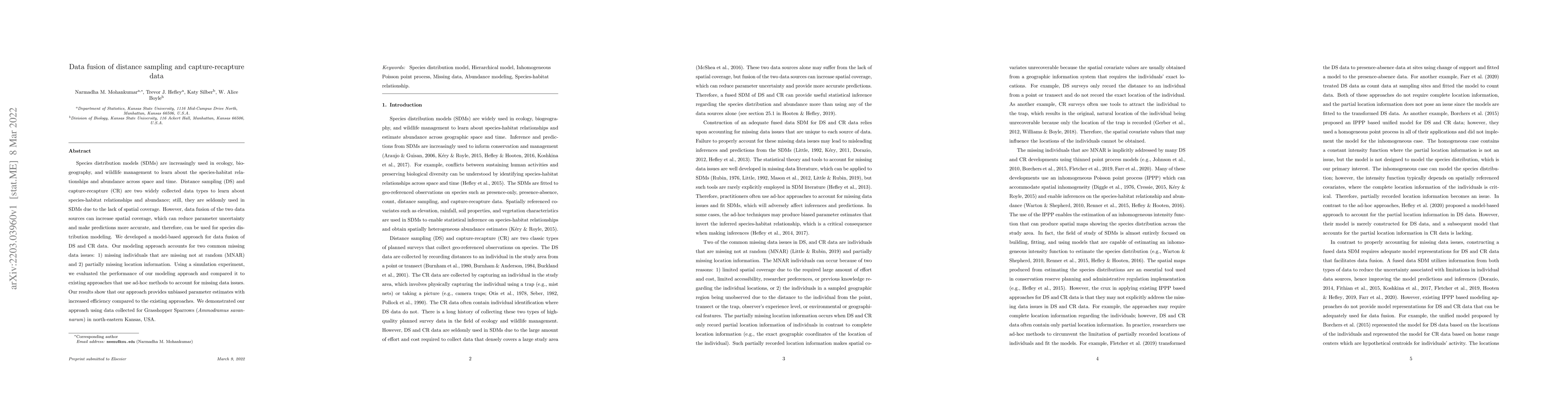 Researchers developed a model-based approach to fuse distance sampling and capture-recapture data, improving spatial coverage and accuracy of species distribution models. Their method provides unbiased parameter estimates with increased efficiency compared to existing approaches.