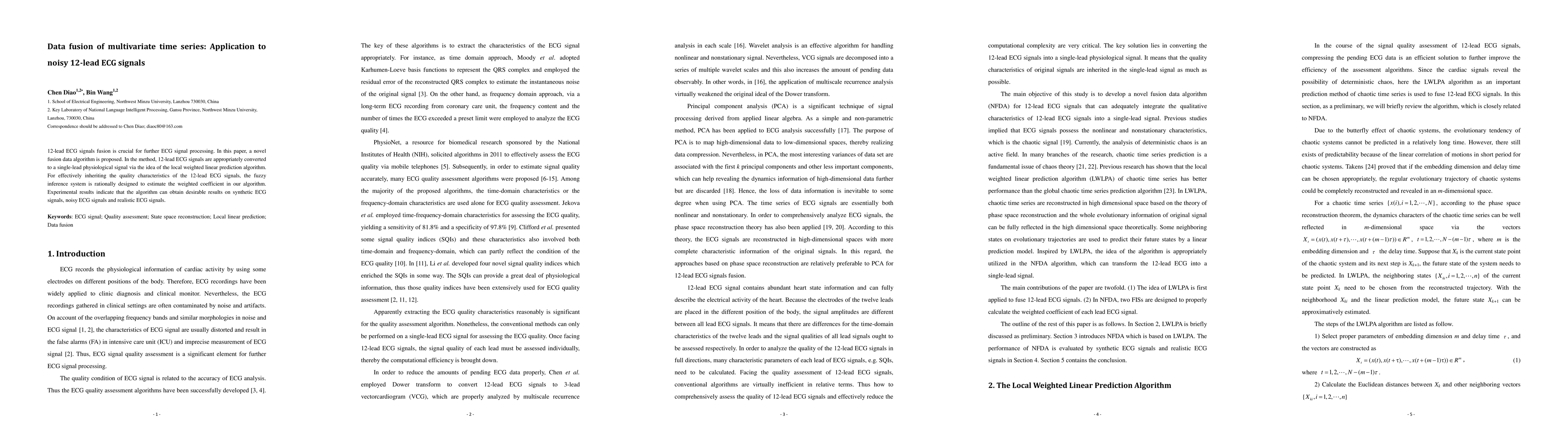 This paper proposes a novel fusion algorithm for converting 12-lead ECG signals into a single-lead signal using a local weighted linear prediction method and a fuzzy inference system to estimate the weighted coefficient. Experimental results show the algorithm effectively handles synthetic, noisy, and realistic ECG signals.