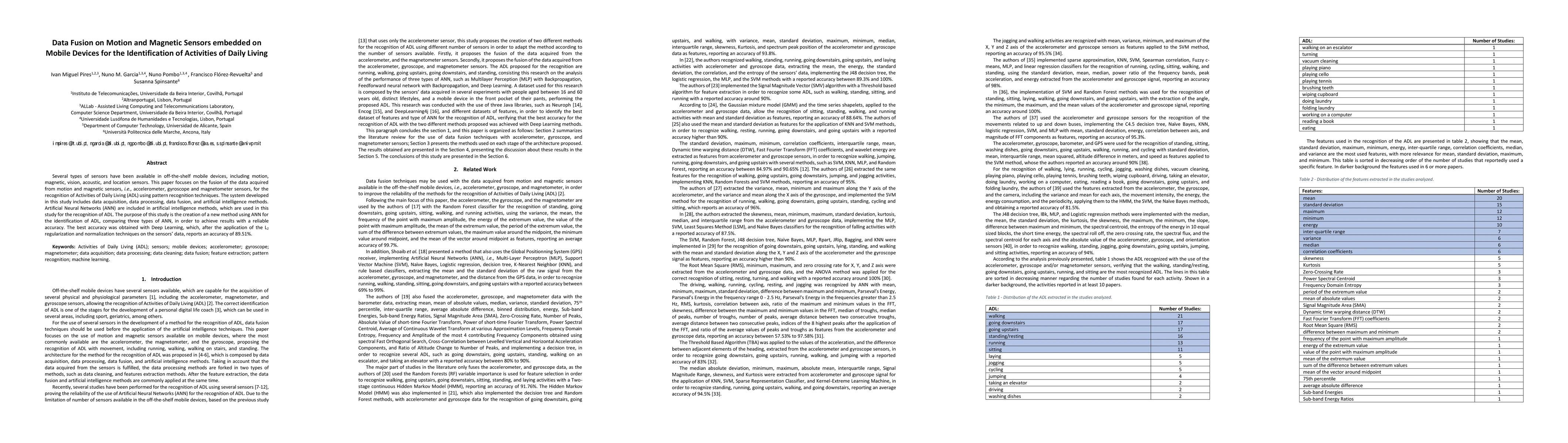 Several types of sensors have been available in off-the-shelf mobile devices, including motion, magnetic, vision, acoustic, and location sensors. This paper focuses on the fusion of the data acquired from motion and magnetic sensors, i.e., accelerometer, gyroscope and magnetometer sensors, for the recognition of Activities of Daily Living (ADL) using pattern recognition techniques. The system developed in this study includes data acquisition, data processing, data fusion, and artificial intelligence methods. Artificial Neural Networks (ANN) are included in artificial intelligence methods, which are used in this study for the recognition of ADL. The purpose of this study is the creation of a new method using ANN for the identification of ADL, comparing three types of ANN, in order to achieve results with a reliable accuracy. The best accuracy was obtained with Deep Learning, which, after the application of the L2 regularization and normalization techniques on the sensors data, reports an accuracy of 89.51%.