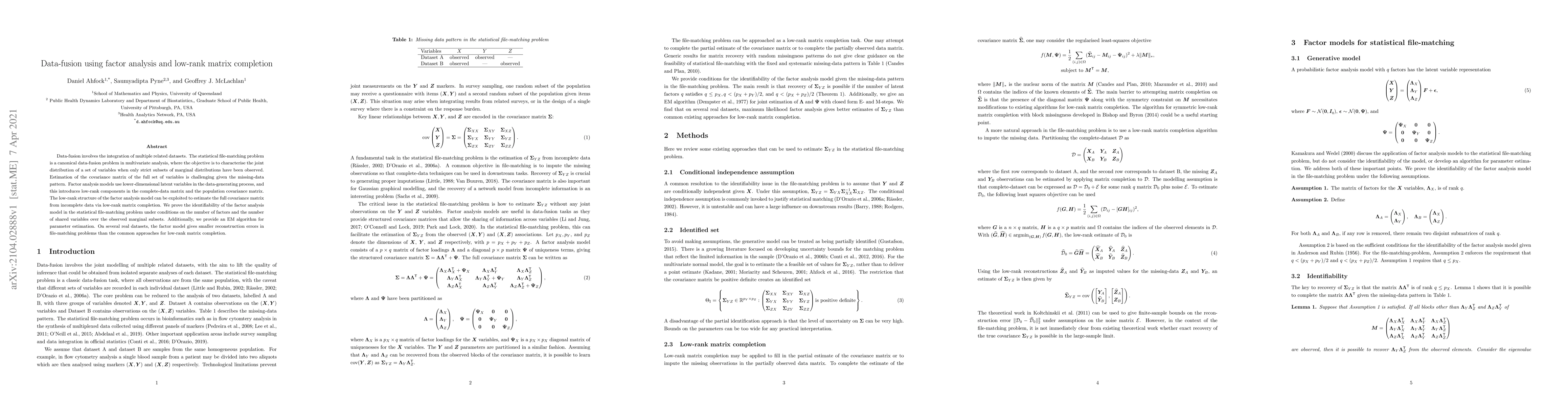 This paper proposes a method for data-fusion using factor analysis and low-rank matrix completion to estimate the full covariance matrix from incomplete datasets. It demonstrates the identifiability of the factor analysis model under specific conditions and provides an EM algorithm for parameter estimation, showing improved performance on real datasets.