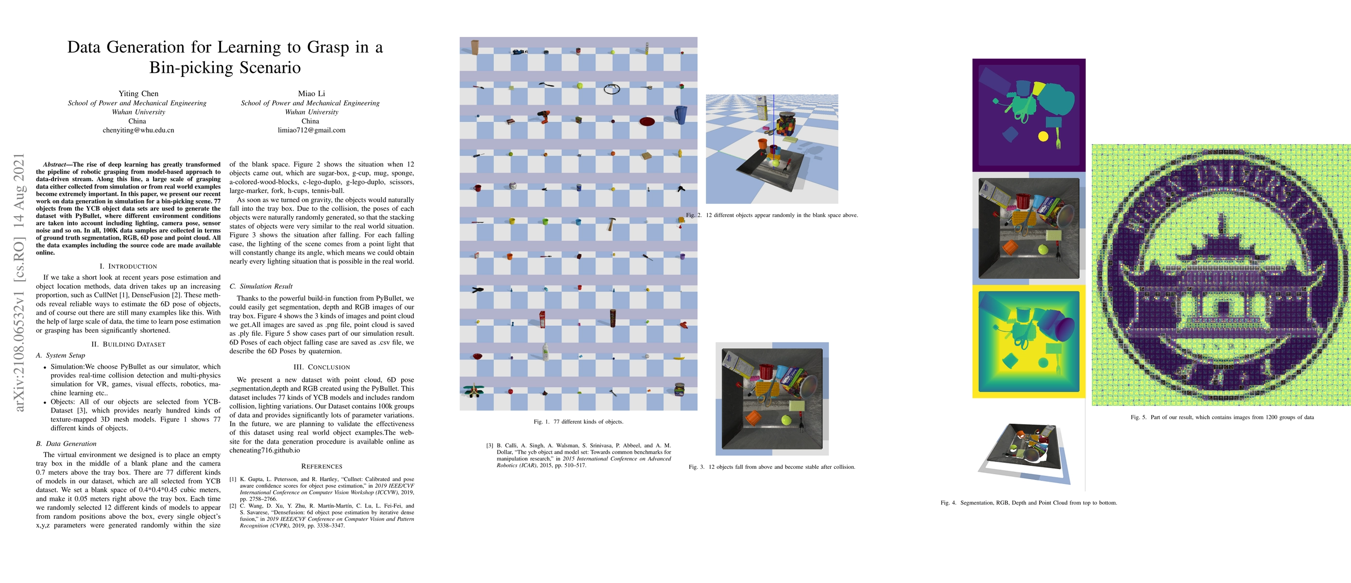 The rise of deep learning has greatly transformed the pipeline of robotic grasping from model-based approach to data-driven stream. Along this line, a large scale of grasping data either collected from simulation or from real world examples become extremely important. In this paper, we present our recent work on data generation in simulation for a bin-picking scene. 77 objects from the YCB object data sets are used to generate the dataset with PyBullet, where different environment conditions are taken into account including lighting, camera pose, sensor noise and so on. In all, 100K data samples are collected in terms of ground truth segmentation, RGB, 6D pose and point cloud. All the data examples including the source code are made available online.