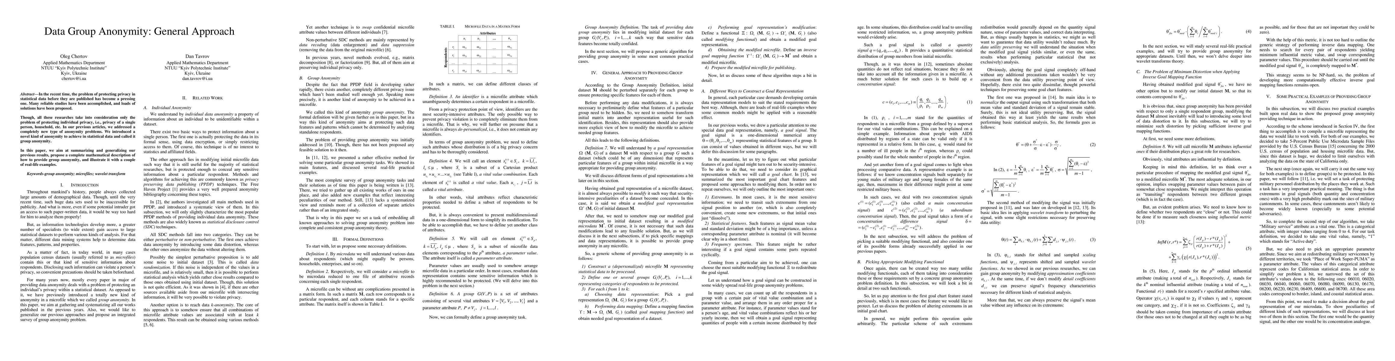 This paper summarizes and generalizes previous findings on a novel approach to group anonymity in statistical data, providing a comprehensive mathematical framework for protecting the privacy of groups rather than individuals, and demonstrating its application through real-life examples.