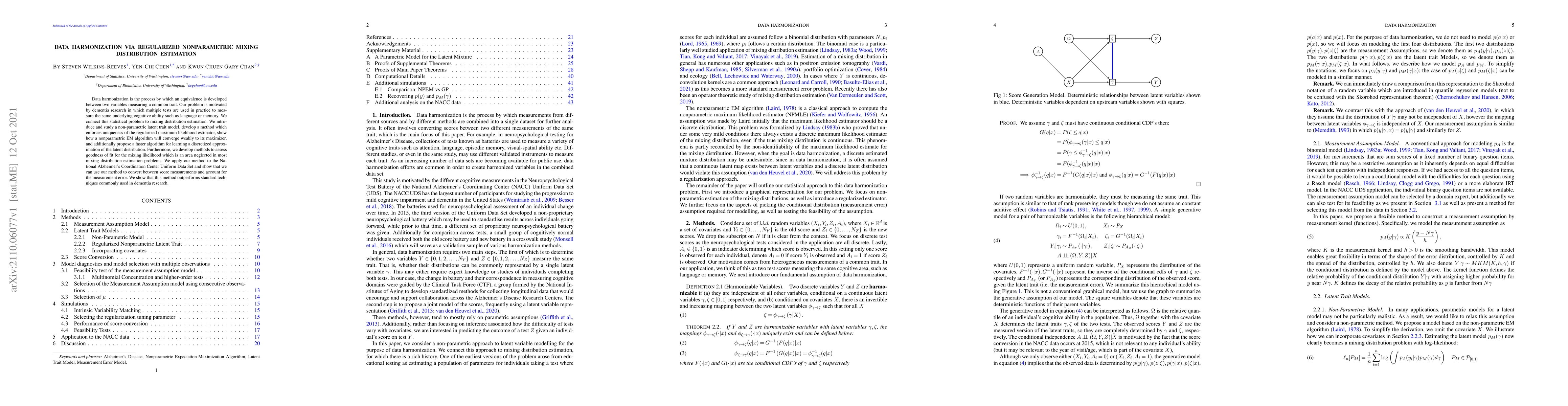 This paper proposes a non-parametric mixing distribution estimation method for data harmonization, specifically for dementia research, to convert between different cognitive ability measurements. The authors develop a regularized maximum likelihood estimator and a nonparametric EM algorithm, demonstrating improved performance over standard techniques.