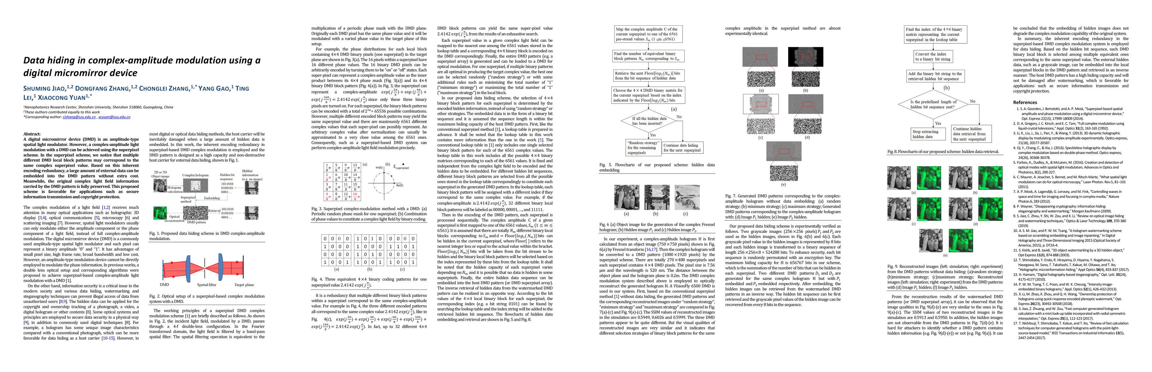 This paper proposes a data hiding method using a digital micromirror device (DMD) with a superpixel scheme, embedding external data without altering the original complex-amplitude light modulation, thus enabling secure information transmission and copyright protection.