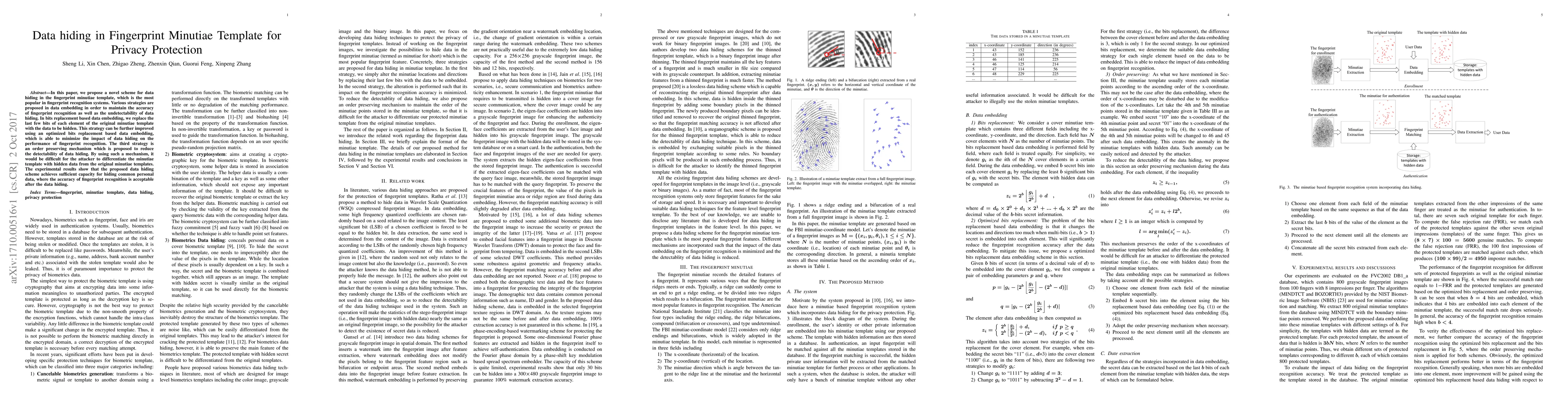 This paper introduces a novel data hiding scheme for fingerprint minutiae templates to protect privacy, employing bits replacement and an order preserving mechanism to maintain recognition accuracy while minimizing detectability. Experimental results demonstrate sufficient data capacity and acceptable recognition performance post-hiding.