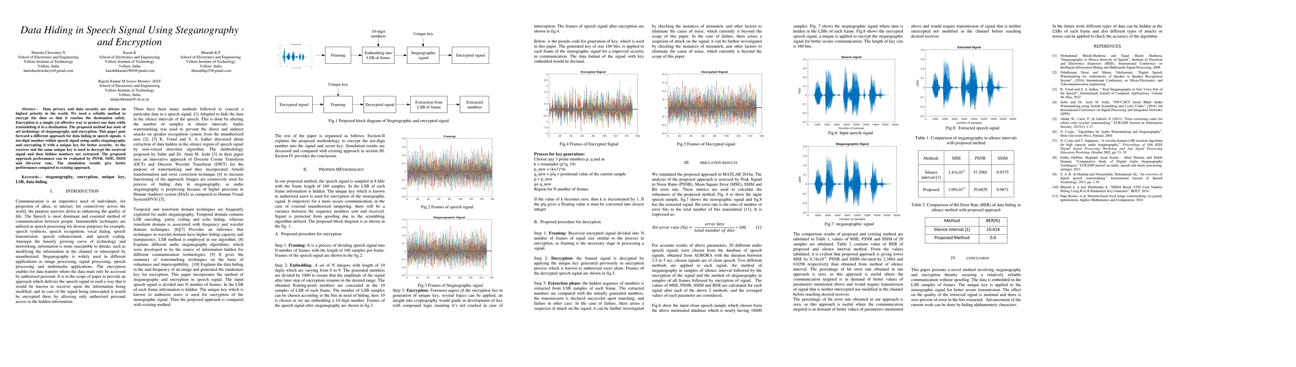 Data privacy and data security are always on highest priority in the world. We need a reliable method to encrypt the data so that it reaches the destination safely. Encryption is a simple yet effective way to protect our data while transmitting it to a destination. The proposed method has state of art technology of steganography and encryption. This paper puts forward a different approach for data hiding in speech signals. A ten-digit number within speech signal using audio steganography and encrypting it with a unique key for better security. At the receiver end the same unique key is used to decrypt the received signal and then hidden numbers are extracted. The proposed approach performance can be evaluated by PSNR, MSE, SSIM and bit-error rate. The simulation results give better performance compared to existing approach.