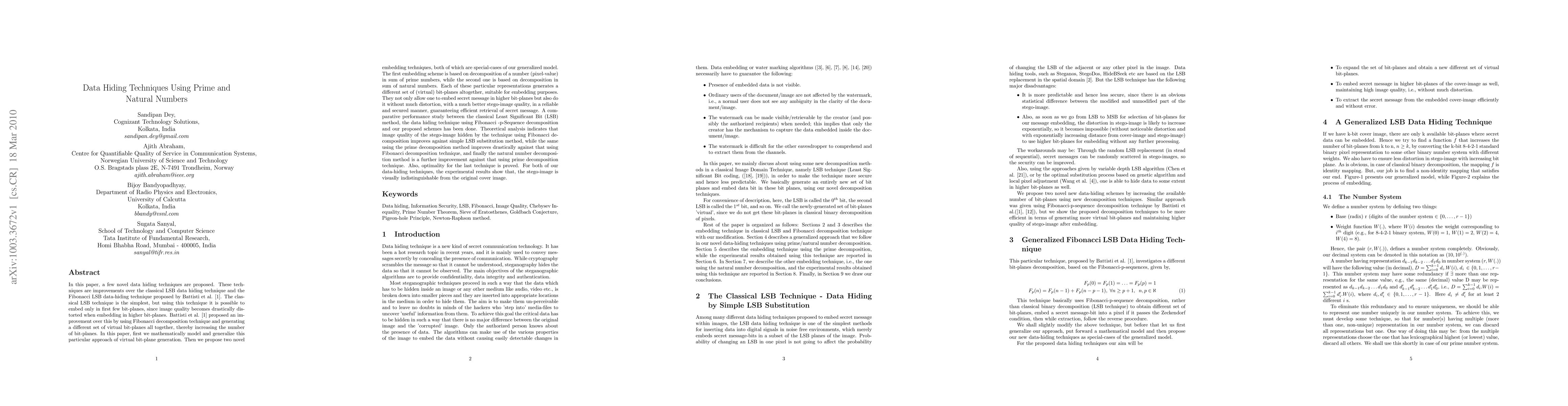 This paper proposes two novel data hiding techniques based on prime and natural number decompositions, improving upon classical LSB and Fibonacci LSB methods. The techniques generate virtual bit-planes that allow embedding in higher bit-planes with minimal distortion, achieving better stego-image quality and secure message retrieval. Comparative performance studies show significant improvements over existing methods.