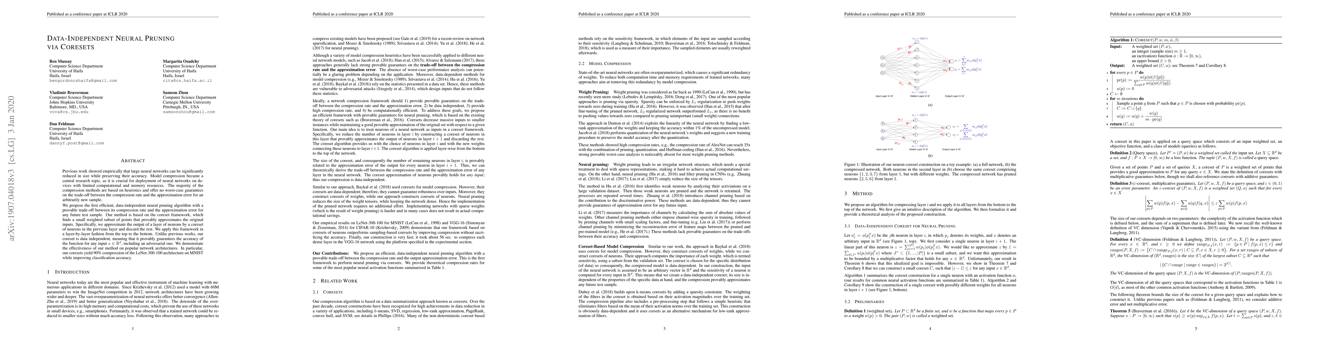 Previous work showed empirically that large neural networks can be significantly reduced in size while preserving their accuracy. Model compression became a central research topic, as it is crucial for deployment of neural networks on devices with limited computational and memory resources. The majority of the compression methods are based on heuristics and offer no worst-case guarantees on the trade-off between the compression rate and the approximation error for an arbitrarily new sample. We propose the first efficient, data-independent neural pruning algorithm with a provable trade-off between its compression rate and the approximation error for any future test sample. Our method is based on the coreset framework, which finds a small weighted subset of points that provably approximates the original inputs. Specifically, we approximate the output of a layer of neurons by a coreset of neurons in the previous layer and discard the rest. We apply this framework in a layer-by-layer fashion from the top to the bottom. Unlike previous works, our coreset is data independent, meaning that it provably guarantees the accuracy of the function for any input $x\in \mathbb{R}^d$, including an adversarial one. We demonstrate the effectiveness of our method on popular network architectures. In particular, our coresets yield 90\% compression of the LeNet-300-100 architecture on MNIST while improving the accuracy.