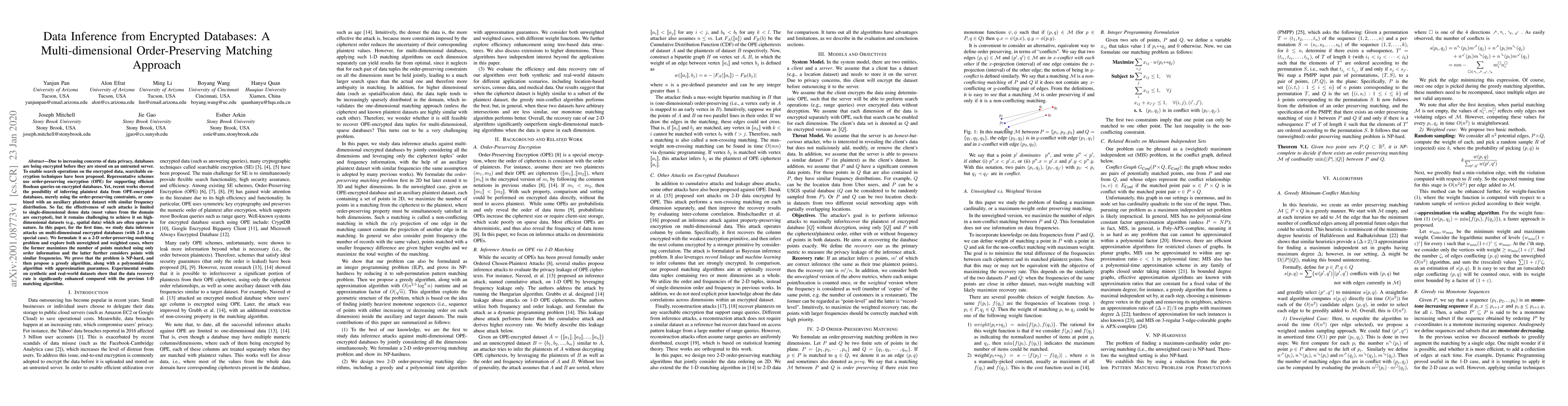 This paper investigates data inference attacks on multi-dimensional encrypted databases using order-preserving encryption (OPE). It formulates the problem as a 2-D order-preserving matching issue, proposing both greedy and polynomial-time algorithms with approximation guarantees, which significantly improve data recovery rates compared to single-dimensional methods.