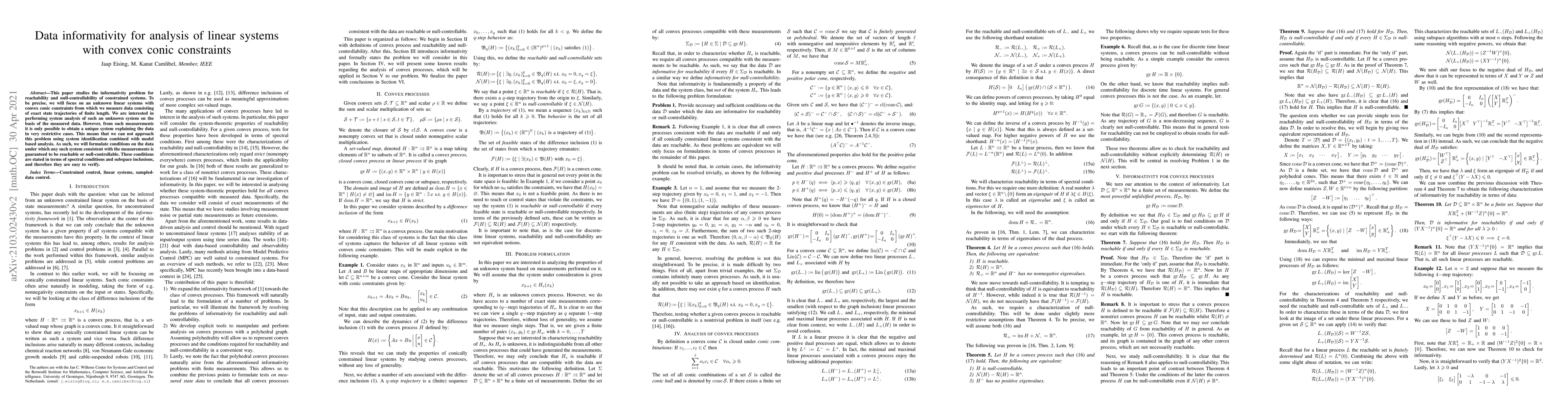 This paper studies the informativity problem for reachability and null-controllability of constrained systems. To be precise, we will focus on an unknown linear systems with convex conic constraints from which we measure data consisting of exact state trajectories of finite length. We are interested in performing system analysis of such an unknown system on the basis of the measured data. However, from such measurements it is only possible to obtain a unique system explaining the data in very restrictive cases. This means that we can not approach this problem using system identification combined with model based analysis. As such, we will formulate conditions on the data under which any such system consistent with the measurements is guaranteed to be reachable or null-controllable. These conditions are stated in terms of spectral conditions and subspace inclusions, and therefore they are easy to verify.