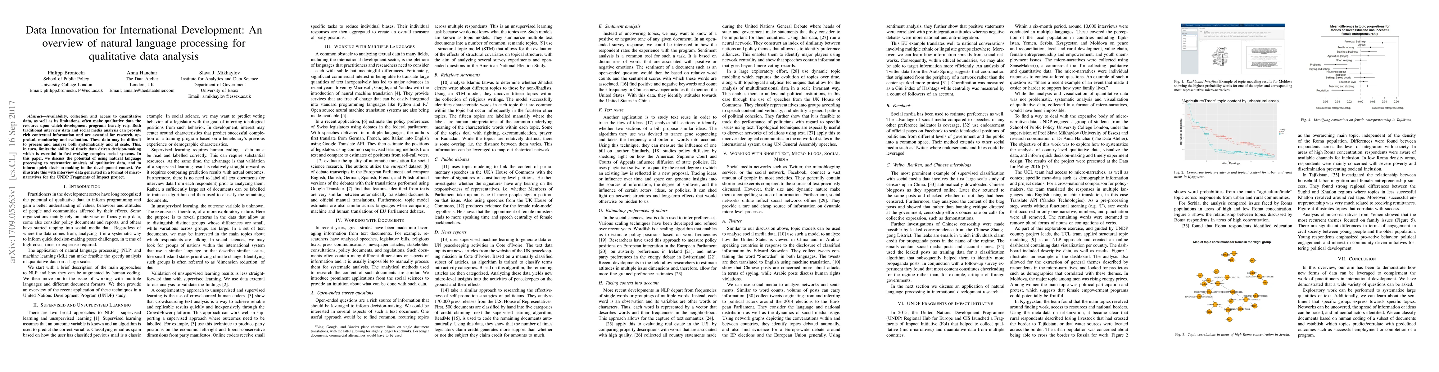 Availability, collection and access to quantitative data, as well as its limitations, often make qualitative data the resource upon which development programs heavily rely. Both traditional interview data and social media analysis can provide rich contextual information and are essential for research, appraisal, monitoring and evaluation. These data may be difficult to process and analyze both systematically and at scale. This, in turn, limits the ability of timely data driven decision-making which is essential in fast evolving complex social systems. In this paper, we discuss the potential of using natural language processing to systematize analysis of qualitative data, and to inform quick decision-making in the development context. We illustrate this with interview data generated in a format of micro-narratives for the UNDP Fragments of Impact project.
