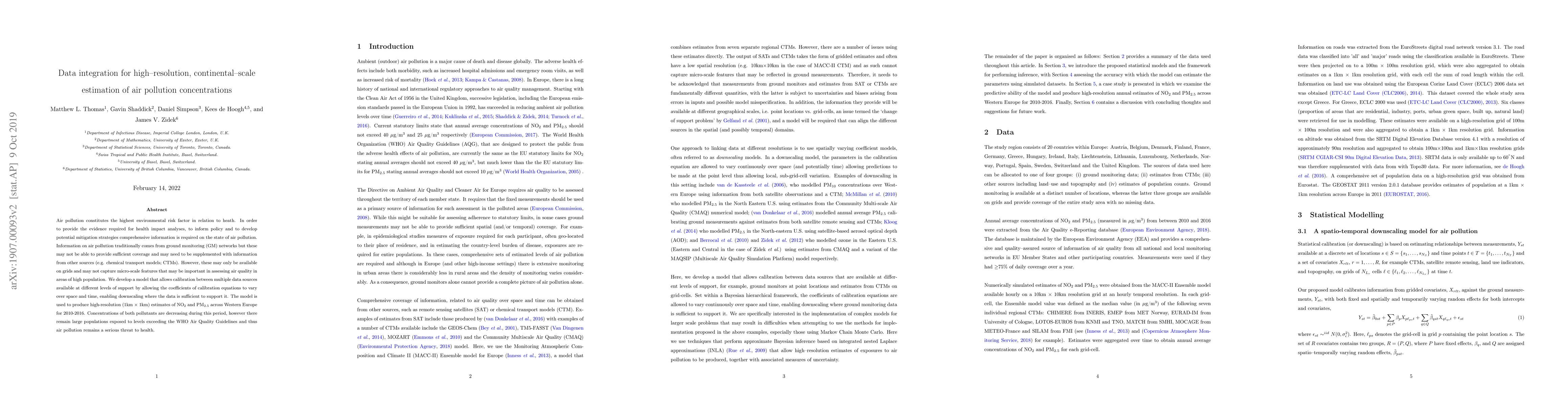 This paper develops a model to integrate multiple data sources for high-resolution air pollution estimation across Western Europe. The model calibrates data from ground monitoring and chemical transport models to produce 1km $\times$ 1km estimates of NO$_2$ and PM$_{2.5}$, revealing persistent health risks despite decreasing pollution levels.