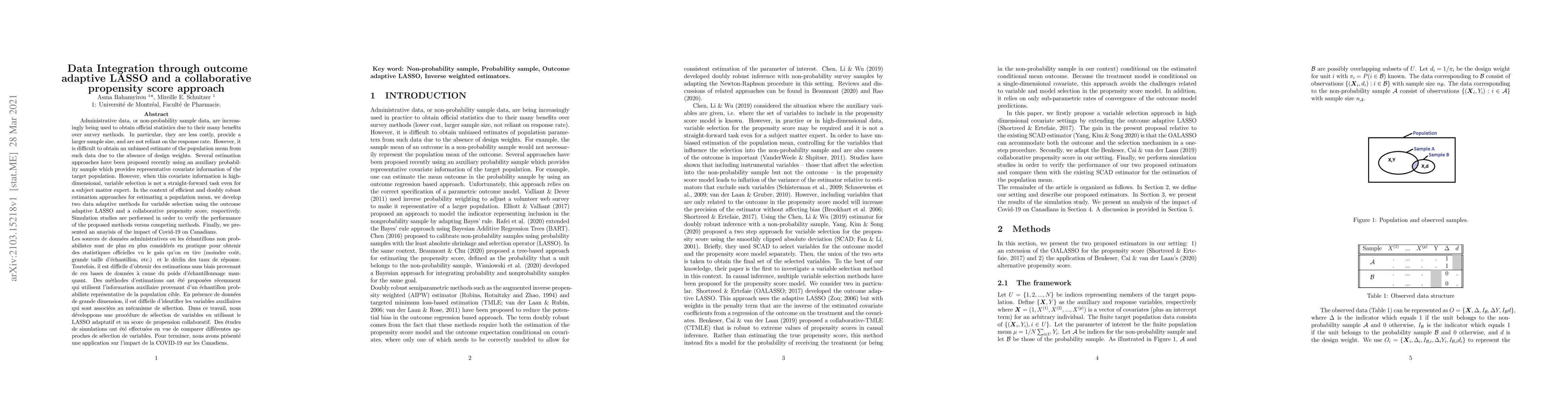 This paper proposes adaptive LASSO and collaborative propensity score methods for integrating administrative data to estimate population means, addressing the challenge of high-dimensional variable selection. Simulation studies compare the performance of these methods, and an analysis of the Covid-19 impact on Canadians is presented.
