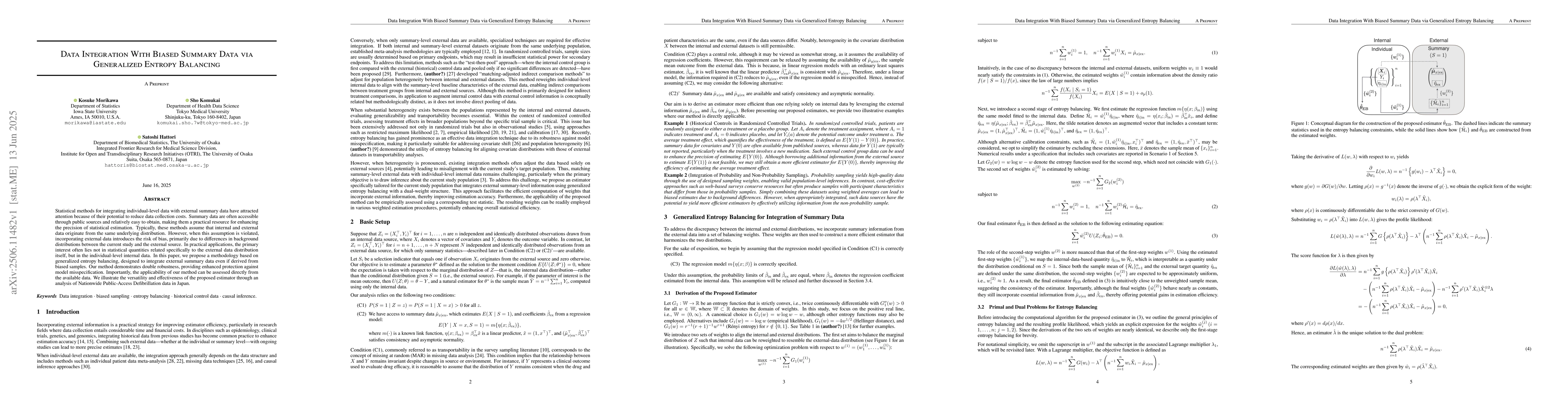 This paper introduces a methodology for integrating biased external summary data with internal individual-level data using generalized entropy balancing. The proposed approach ensures double robustness, mitigating bias risks and model misspecification, with applicability directly assessable from available data. Its effectiveness is demonstrated through an analysis of Japanese public-access defibrillation data.