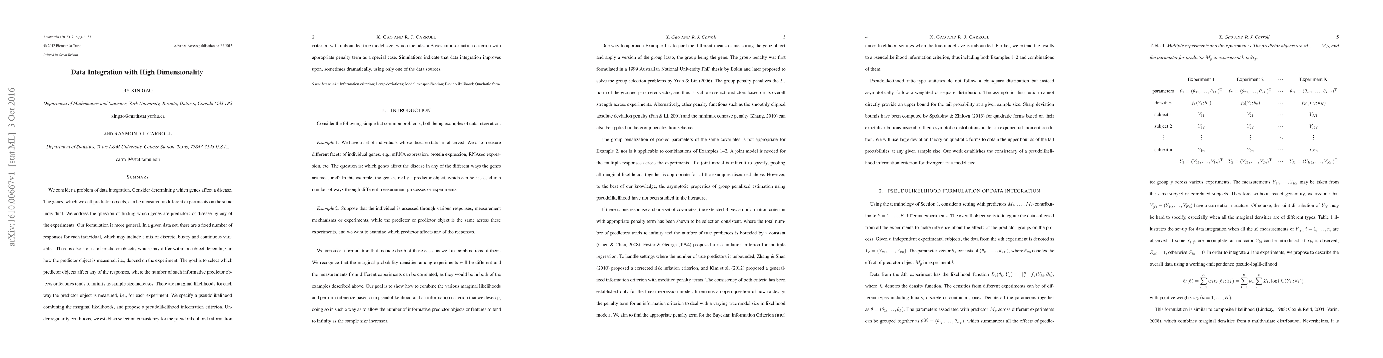 Researchers developed a method to integrate data from multiple experiments to identify genes affecting a disease, improving upon results using individual experiments. Their pseudolikelihood information criterion showed selection consistency with unbounded true model size.