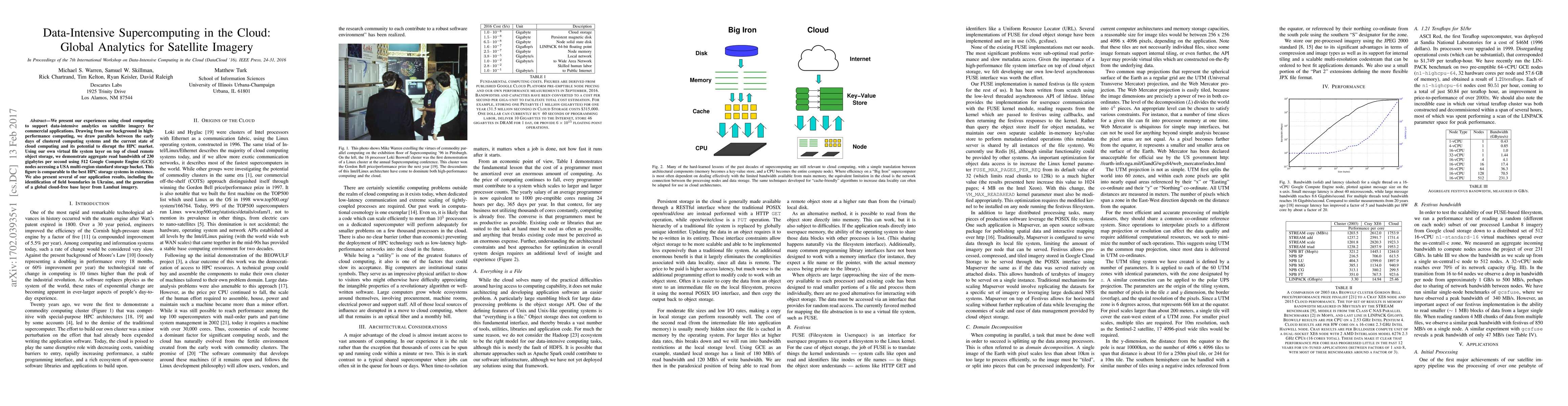 This paper explores the use of cloud computing for data-intensive analytics on satellite imagery, achieving an aggregate read bandwidth of 230 GB/s using 512 Google Compute Engine nodes. It highlights the potential for cloud computing to disrupt high-performance computing markets and showcases applications like field boundary identification and global cloud-free base layer generation.