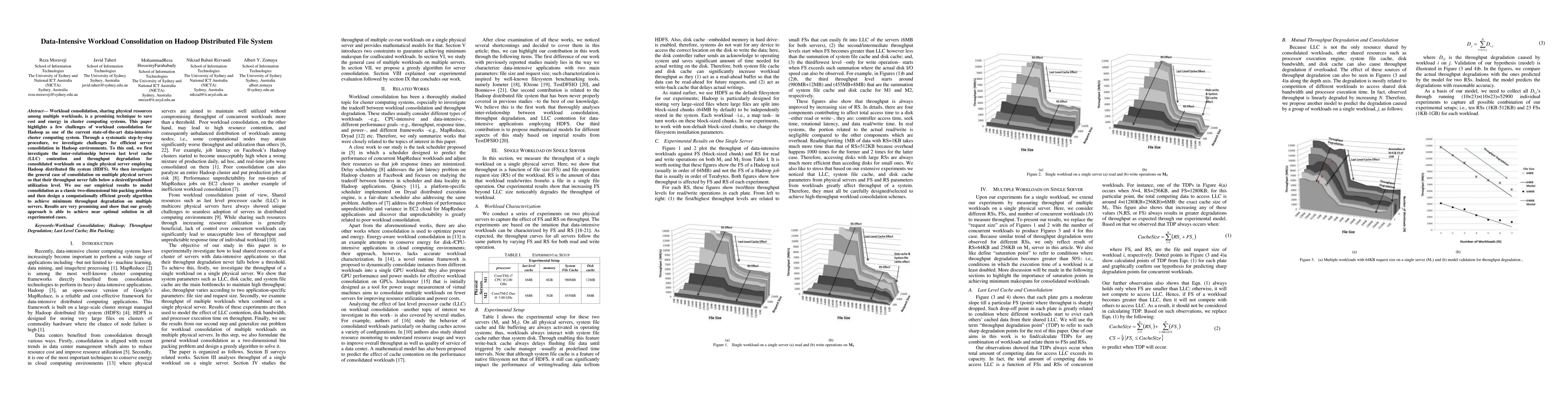 This paper explores the challenges of consolidating workloads on Hadoop to save costs and energy, focusing on minimizing throughput degradation due to last level cache contention and resource allocation across multiple servers. It proposes a greedy algorithm to optimize server consolidation, achieving near-optimal results in empirical tests.