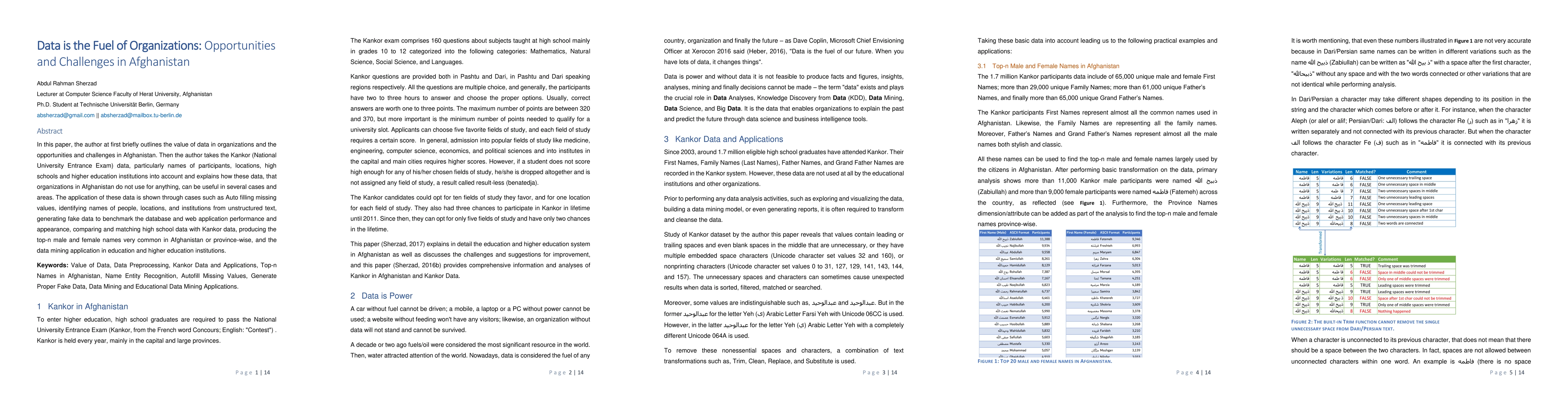 In this paper, the author at first briefly outlines the value of data in organizations and the opportunities and challenges in Afghanistan. Then the author takes the Kankor (National University Entrance Exam) data, particularly names of participants, locations, high schools and higher education institutions into account and explains how these data, that organizations in Afghanistan do not use for anything, can be useful in several cases and areas. The application of these data is shown through cases such as Auto filling missing values, identifying names of people, locations, and institutions from unstructured text, generating fake data to benchmark the database and web application performance and appearance, comparing and matching high school data with Kankor data, producing the top-n male and female names very common in Afghanistan or province-wise, and the data mining application in education and higher education institutions.