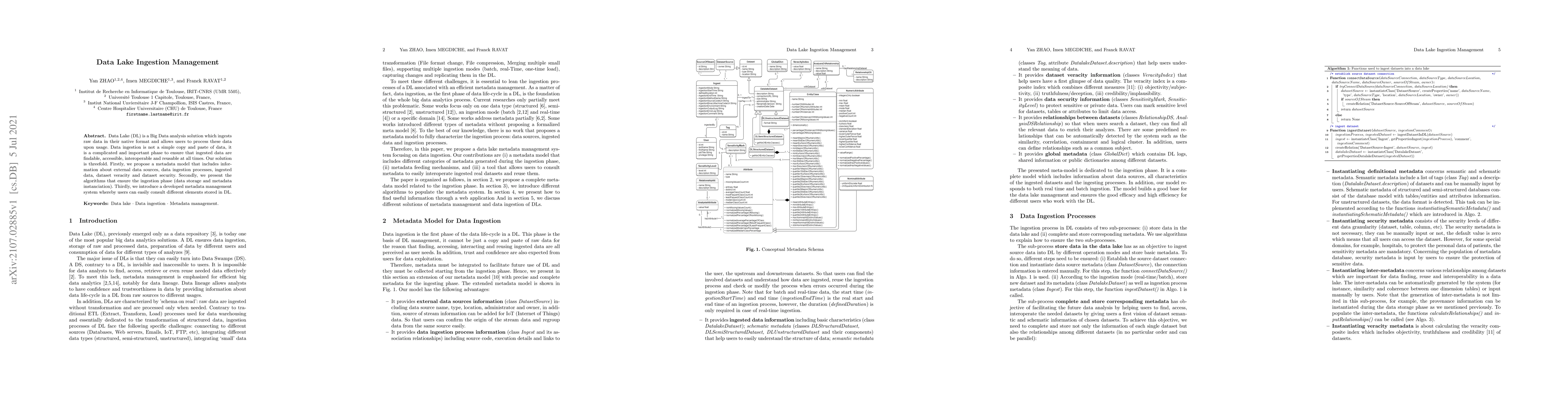 This paper proposes a comprehensive data ingestion management system for Data Lakes, featuring a metadata model for data sources and processes, algorithms for efficient ingestion, and a metadata management system for user accessibility. The focus is on ensuring data findability, accessibility, interoperability, and reusability.