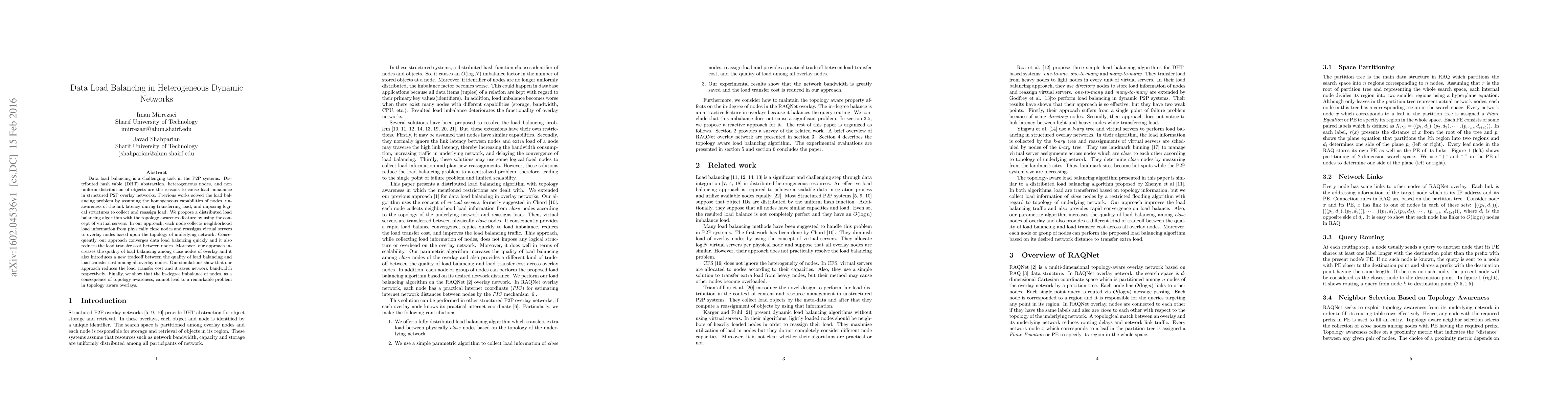 This paper proposes a distributed load balancing algorithm for heterogeneous dynamic P2P networks, addressing load imbalance caused by heterogeneous nodes and non-uniform object distribution. The algorithm uses topology awareness and virtual servers to quickly balance load and reduce transfer costs, demonstrating improved load balancing quality and efficiency in simulations.