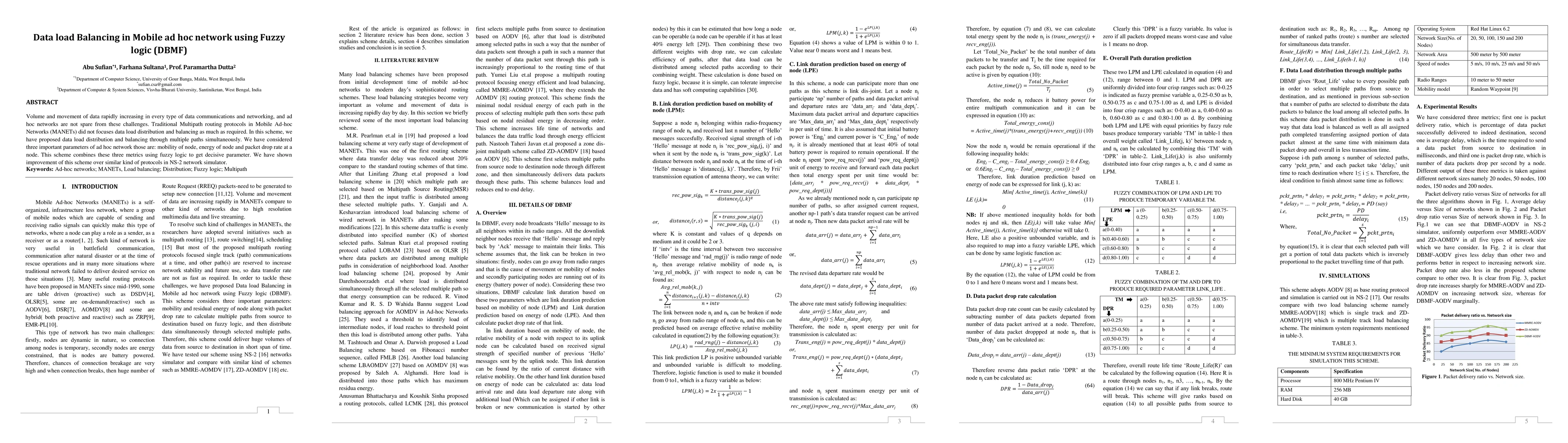 Volume and movement of data rapidly increasing in every type of data communications and networking, and ad hoc networks are not spared from these challenges. Traditional Multipath routing protocols in Mobile Ad-hoc Networks (MANETs) did not focus on data load distribution and balancing as much as required. In this scheme, we have proposed data load distribution and balancing through multiple paths simultaneously. We have considered three important parameters of ad hoc network those are: mobility of node, the energy of node and packet drop rate at a node. This scheme combines these three metrics using fuzzy logic to get the decisive parameter. We have shown improvement of this scheme over similar kind of protocols in NS-2 network simulator.