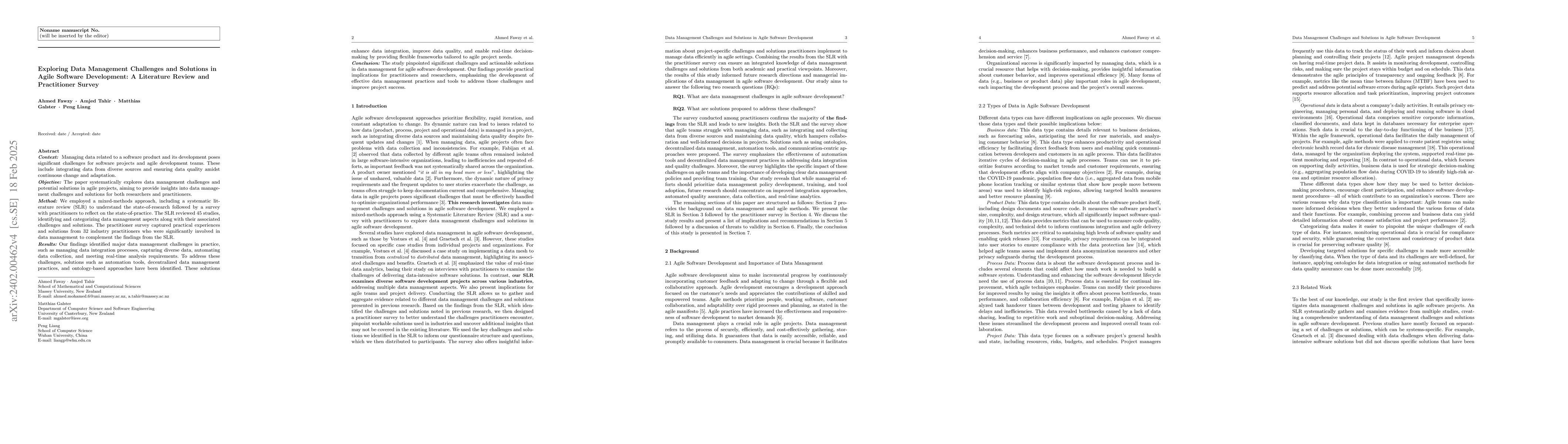 This paper systematically reviews data management challenges in agile software projects, identifying key issues like data integration and quality assurance. It proposes solutions such as ontologies, automated tools, and standardized practices to improve data management, emphasizing the need for tailored strategies within agile frameworks.