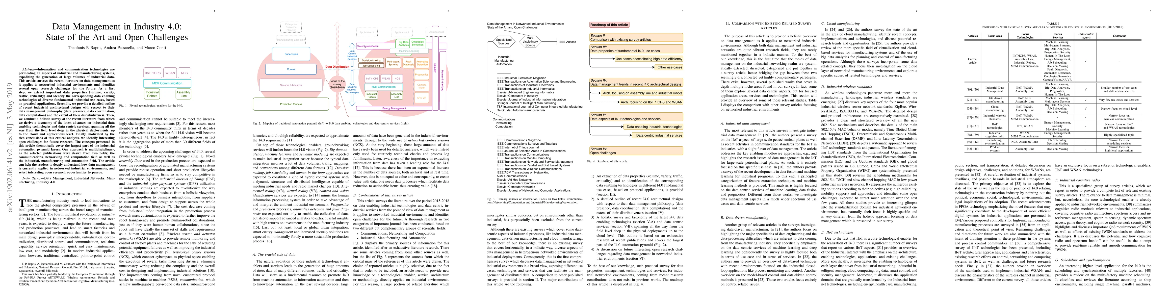 This paper surveys data management in Industry 4.0, identifying key data properties (volume, variety, traffic, criticality) and enabling technologies for industrial use cases. It outlines recent architectural designs, presents a taxonomy of industrial data technologies, and highlights open research challenges, aiming to guide future studies in this multidisciplinary field.