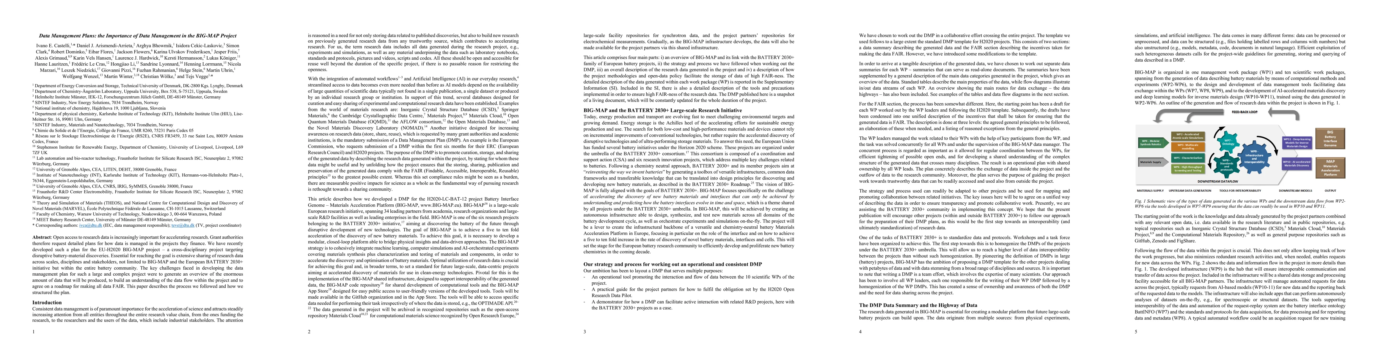 Researchers developed a data management plan for the EU-H2020 BIG-MAP project to ensure open access to research data and accelerate battery material discoveries. The plan aims to make data FAIR and accessible across scales, disciplines, and stakeholders in the entire battery community.