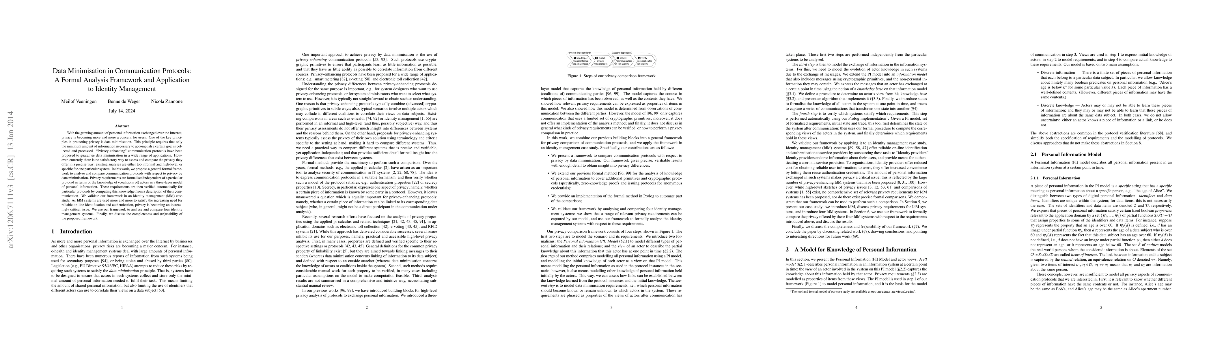 With the growing amount of personal information exchanged over the Internet, privacy is becoming more and more a concern for users. One of the key principles in protecting privacy is data minimisation. This principle requires that only the minimum amount of information necessary to accomplish a certain goal is collected and processed. "Privacy-enhancing" communication protocols have been proposed to guarantee data minimisation in a wide range of applications. However, currently there is no satisfactory way to assess and compare the privacy they offer in a precise way: existing analyses are either too informal and high-level, or specific for one particular system. In this work, we propose a general formal framework to analyse and compare communication protocols with respect to privacy by data minimisation. Privacy requirements are formalised independent of a particular protocol in terms of the knowledge of (coalitions of) actors in a three-layer model of personal information. These requirements are then verified automatically for particular protocols by computing this knowledge from a description of their communication. We validate our framework in an identity management (IdM) case study. As IdM systems are used more and more to satisfy the increasing need for reliable on-line identification and authentication, privacy is becoming an increasingly critical issue. We use our framework to analyse and compare four identity management systems. Finally, we discuss the completeness and (re)usability of the proposed framework.