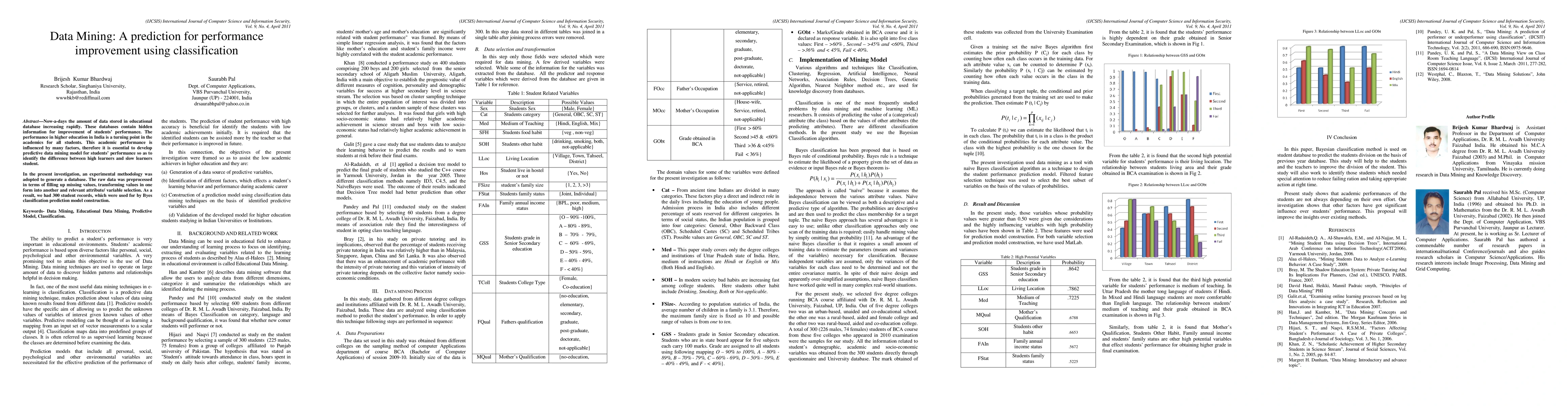 Now-a-days the amount of data stored in educational database increasing rapidly. These databases contain hidden information for improvement of students' performance. The performance in higher education in India is a turning point in the academics for all students. This academic performance is influenced by many factors, therefore it is essential to develop predictive data mining model for students' performance so as to identify the difference between high learners and slow learners student. In the present investigation, an experimental methodology was adopted to generate a database. The raw data was preprocessed in terms of filling up missing values, transforming values in one form into another and relevant attribute/ variable selection. As a result, we had 300 student records, which were used for by Byes classification prediction model construction. Keywords- Data Mining, Educational Data Mining, Predictive Model, Classification.