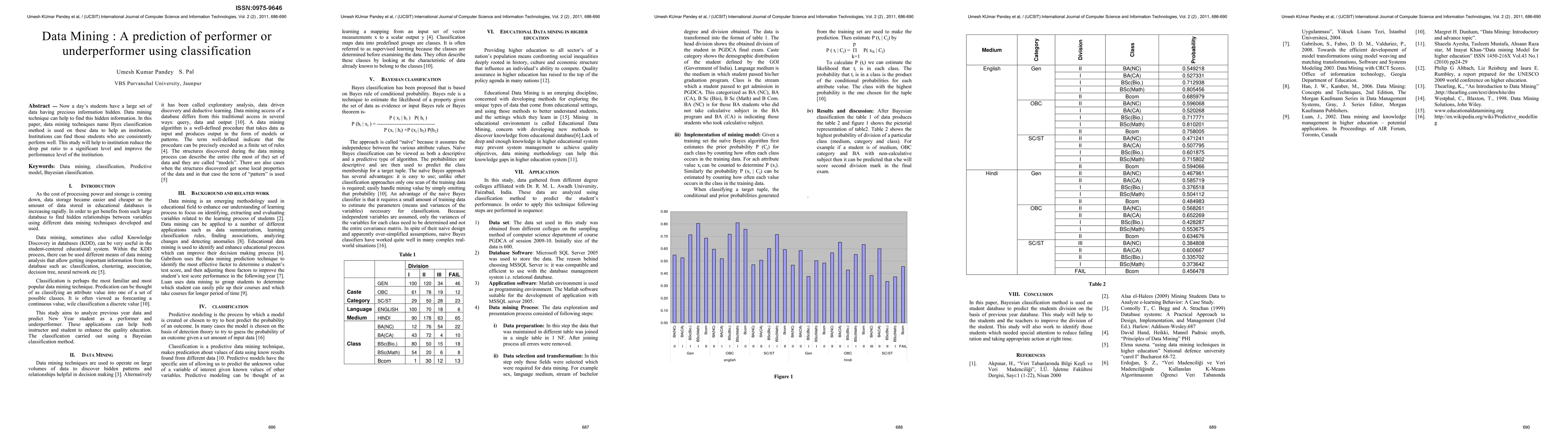 Now a day's students have a large set of data having precious information hidden. Data mining technique can help to find this hidden information. In this paper, data mining techniques name Byes classification method is used on these data to help an institution. Institutions can find those students who are consistently perform well. This study will help to institution reduce the drop put ratio to a significant level and improve the performance level of the institution.