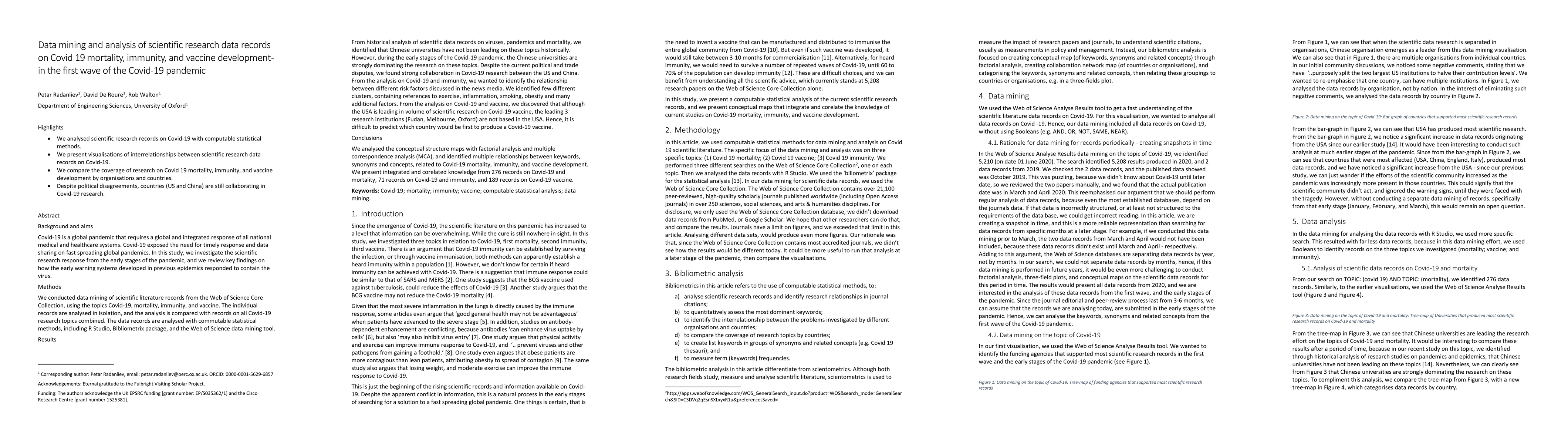 This study analyzes scientific research data from the early Covid-19 pandemic, focusing on mortality, immunity, and vaccine development. Using statistical methods and data mining tools, it identifies clusters related to various factors like exercise and smoking, revealing that despite the USA leading in Covid-19 vaccine research, top institutions are not based in the USA, complicating predictions on vaccine production.