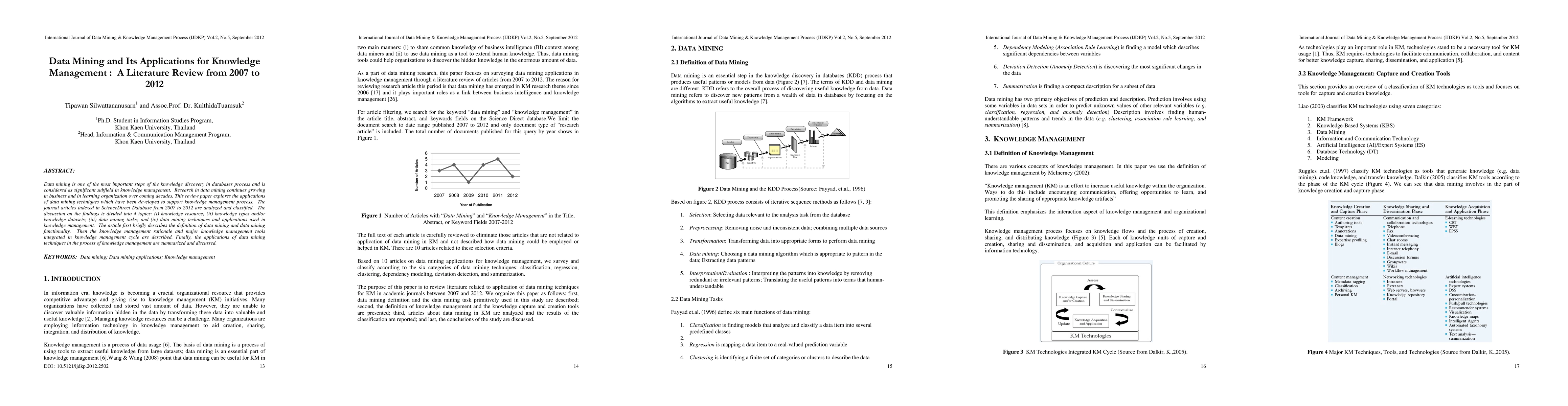 This paper reviews data mining applications in knowledge management from 2007 to 2012, analyzing journal articles to classify and discuss developments in knowledge resources, types, mining tasks, and techniques. It highlights the growing importance of data mining in supporting knowledge management processes.