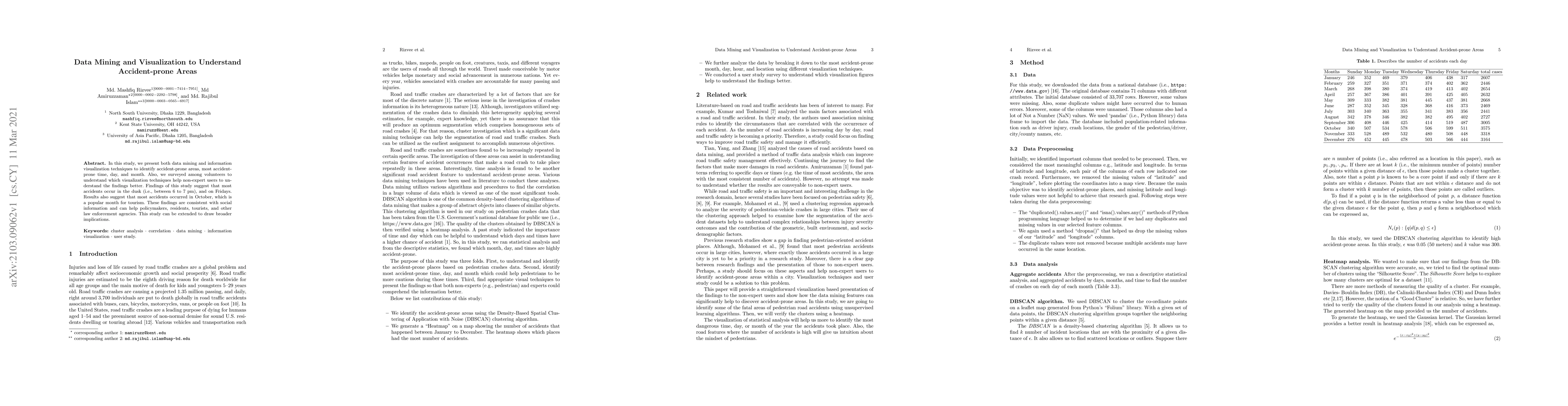 This paper uses data mining and visualization to identify accident-prone areas, times, and days, finding that most accidents occur in the evening on Fridays and in October. Survey results indicate effective visualization techniques for non-expert users.
