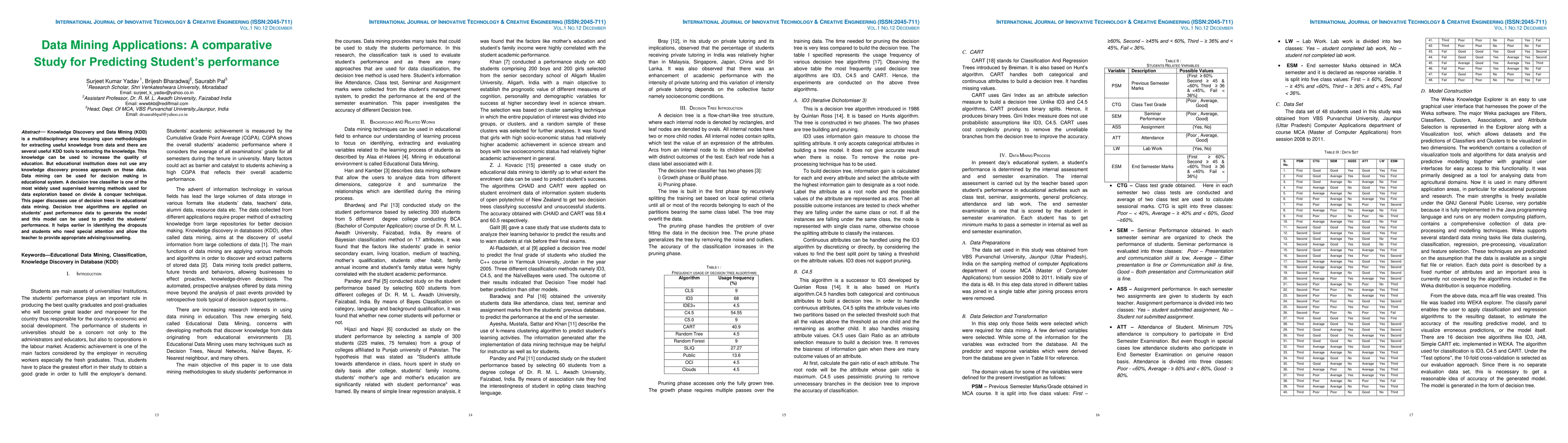 Knowledge Discovery and Data Mining (KDD) is a multidisciplinary area focusing upon methodologies for extracting useful knowledge from data and there are several useful KDD tools to extracting the knowledge. This knowledge can be used to increase the quality of education. But educational institution does not use any knowledge discovery process approach on these data. Data mining can be used for decision making in educational system. A decision tree classifier is one of the most widely used supervised learning methods used for data exploration based on divide & conquer technique. This paper discusses use of decision trees in educational data mining. Decision tree algorithms are applied on students' past performance data to generate the model and this model can be used to predict the students' performance. It helps earlier in identifying the dropouts and students who need special attention and allow the teacher to provide appropriate advising/counseling.