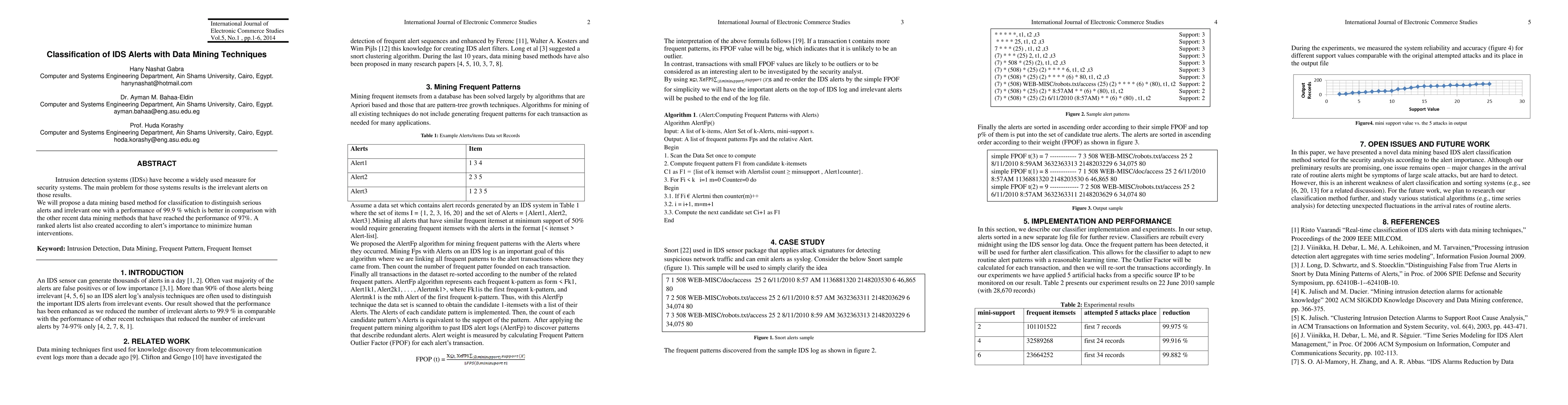 This paper proposes a data mining technique for classifying IDS alerts, achieving a high accuracy of 99.9% in distinguishing serious from irrelevant alerts, outperforming recent methods. It also generates a ranked list of alerts based on importance to reduce human intervention.
