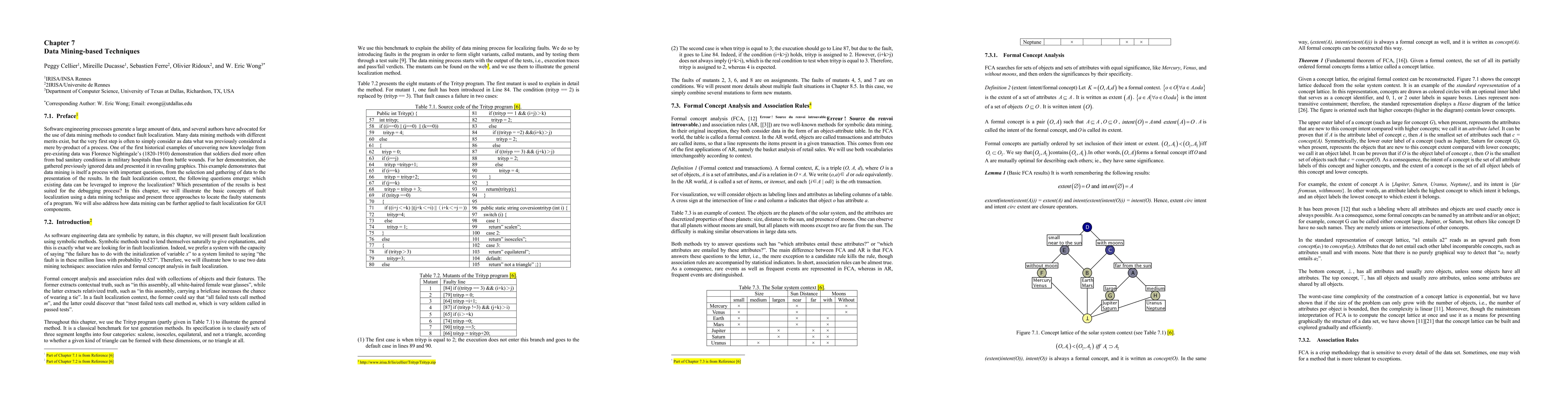 This chapter illustrates the basic concepts of fault localization using a data mining technique. It utilizes the Trityp program to illustrate the general method. Formal concept analysis and association rule are two well-known methods for symbolic data mining. In their original inception, they both consider data in the form of an object-attribute table. In their original inception, they both consider data in the form of an object-attribute table. The chapter considers a debugging process in which a program is tested against different test cases. Two attributes, PASS and FAIL, represent the issue of the test case. The chapter extends the analysis of data mining for fault localization for the multiple fault situations. It addresses how data mining can be further applied to fault localization for GUI components. Unlike traditional software, GUI test cases are usually event sequences, and each individual event has a unique corresponding event handler.