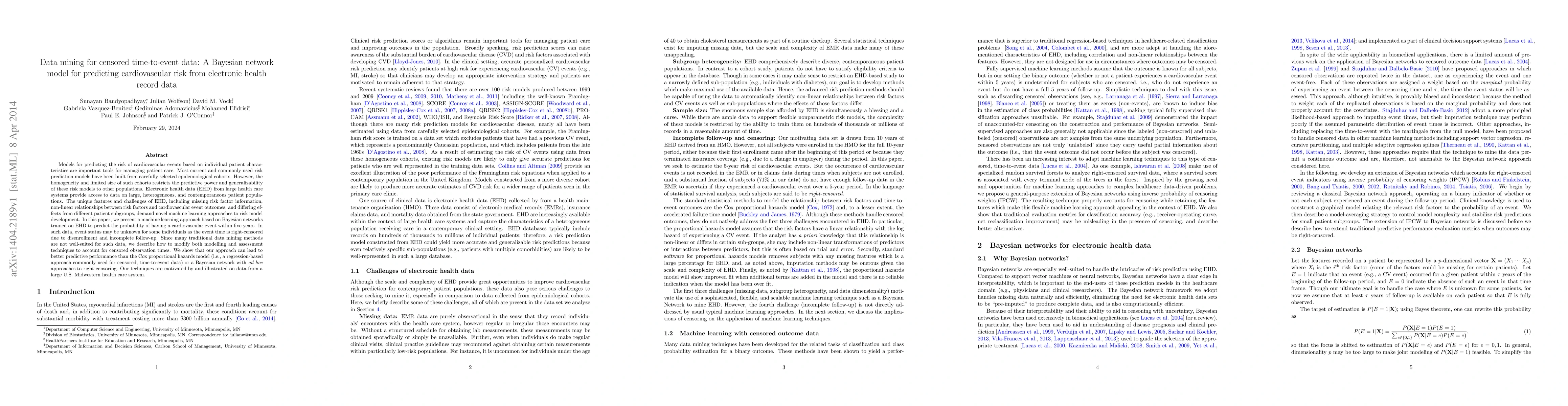 This paper proposes a Bayesian network model for predicting cardiovascular risk from electronic health record data, addressing the challenges of censored time-to-event data. The approach outperforms traditional Cox models and other Bayesian networks by effectively handling censored observations and leveraging large, heterogeneous patient datasets.