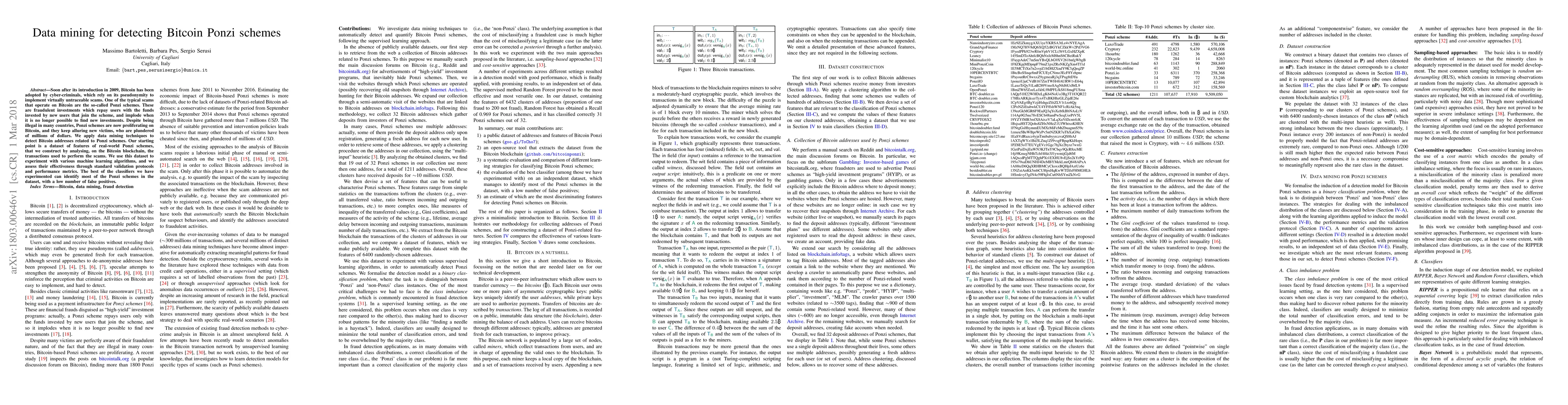 Soon after its introduction in 2009, Bitcoin has been adopted by cyber-criminals, which rely on its pseudonymity to implement virtually untraceable scams. One of the typical scams that operate on Bitcoin are the so-called Ponzi schemes. These are fraudulent investments which repay users with the funds invested by new users that join the scheme, and implode when it is no longer possible to find new investments. Despite being illegal in many countries, Ponzi schemes are now proliferating on Bitcoin, and they keep alluring new victims, who are plundered of millions of dollars. We apply data mining techniques to detect Bitcoin addresses related to Ponzi schemes. Our starting point is a dataset of features of real-world Ponzi schemes, that we construct by analysing, on the Bitcoin blockchain, the transactions used to perform the scams. We use this dataset to experiment with various machine learning algorithms, and we assess their effectiveness through standard validation protocols and performance metrics. The best of the classifiers we have experimented can identify most of the Ponzi schemes in the dataset, with a low number of false positives.