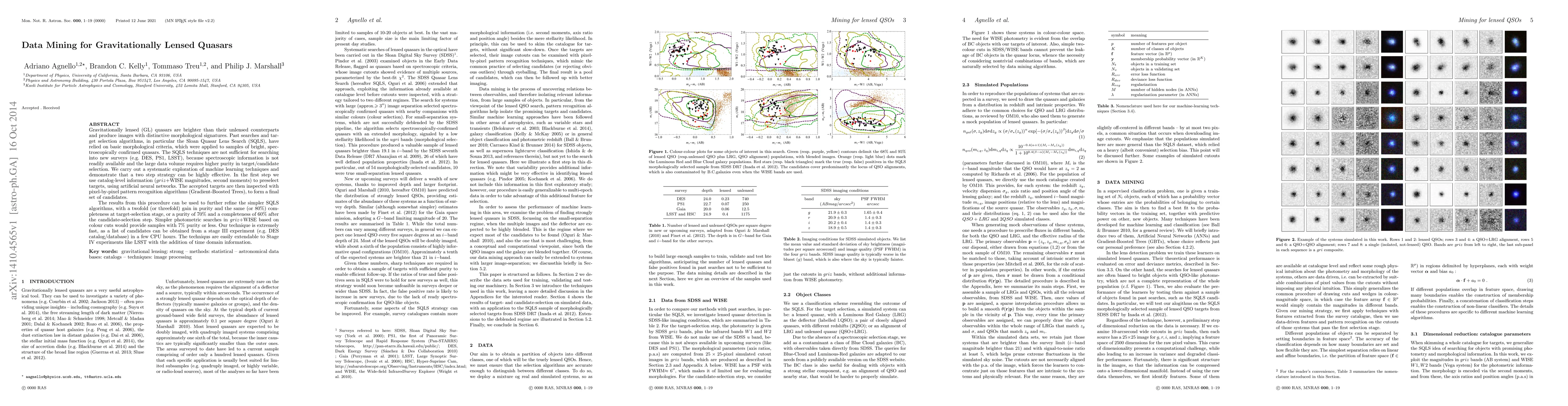 Gravitationally lensed (GL) quasars are brighter than their unlensed counterparts and produce images with distinctive morphological signatures. Past searches and target selection algorithms, in particular the Sloan Quasar Lens Search (SQLS), have relied on basic morphological criteria, which were applied to samples of bright, spectroscopically confirmed quasars. The SQLS techniques are not sufficient for searching into new surveys (e.g. DES, PS1, LSST), because spectroscopic information is not readily available and the large data volume requires higher purity in target/candidate selection. We carry out a systematic exploration of machine learning techniques and demonstrate that a two step strategy can be highly effective. In the first step we use catalog-level information ($griz$+WISE magnitudes, second moments) to preselect targets, using artificial neural networks. The accepted targets are then inspected with pixel-by-pixel pattern recognition algorithms (Gradient-Boosted Trees), to form a final set of candidates. The results from this procedure can be used to further refine the simpler SQLS algorithms, with a twofold (or threefold) gain in purity and the same (or $80\%$) completeness at target-selection stage, or a purity of $70\%$ and a completeness of $60\%$ after the candidate-selection step. Simpler photometric searches in $griz$+WISE based on colour cuts would provide samples with $7\%$ purity or less. Our technique is extremely fast, as a list of candidates can be obtained from a stage III experiment (e.g. DES catalog/database) in {a few} CPU hours. The techniques are easily extendable to Stage IV experiments like LSST with the addition of time domain information.