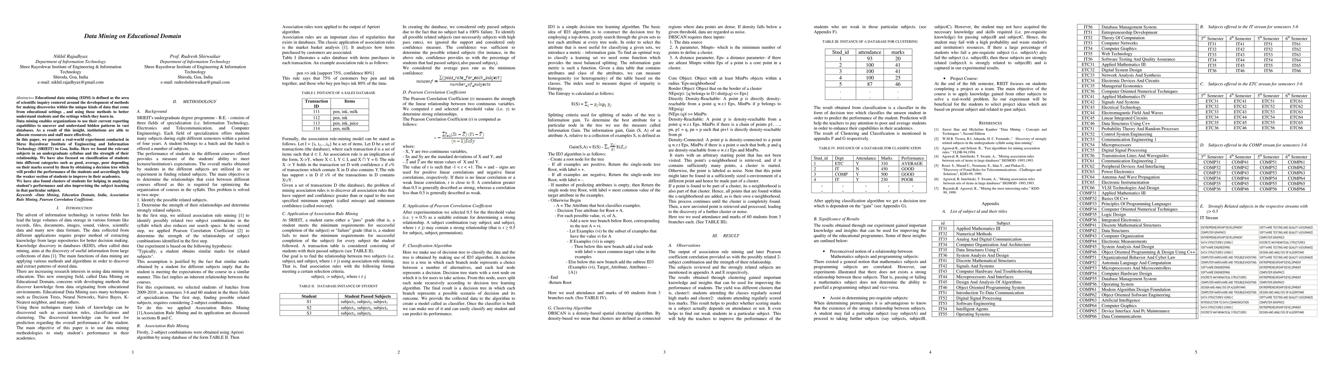This paper explores educational data mining (EDM) to uncover hidden patterns in educational data from Shree Rayeshwar Institute of Engineering and Information Technology. It uses a decision tree to classify students into performance categories and identifies clusters to improve academic support and teaching methods.