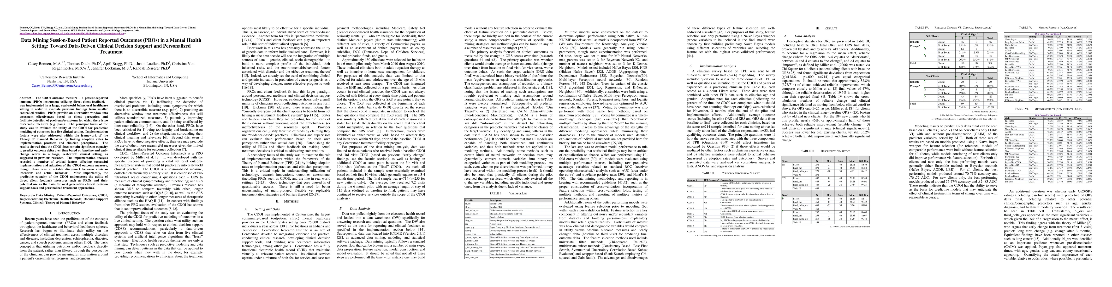 The CDOI outcome measure - a patient-reported outcome (PRO) instrument utilizing direct client feedback - was implemented in a large, real-world behavioral healthcare setting in order to evaluate previous findings from smaller controlled studies. PROs provide an alternative window into treatment effectiveness based on client perception and facilitate detection of problems/symptoms for which there is no discernible measure (e.g. pain). The principal focus of the study was to evaluate the utility of the CDOI for predictive modeling of outcomes in a live clinical setting. Implementation factors were also addressed within the framework of the Theory of Planned Behavior by linking adoption rates to implementation practices and clinician perceptions. The results showed that the CDOI does contain significant capacity to predict outcome delta over time based on baseline and early change scores in a large, real-world clinical setting, as suggested in previous research. The implementation analysis revealed a number of critical factors affecting successful implementation and adoption of the CDOI outcome measure, though there was a notable disconnect between clinician intentions and actual behavior. Most importantly, the predictive capacity of the CDOI underscores the utility of direct client feedback measures such as PROs and their potential use as the basis for next generation clinical decision support tools and personalized treatment approaches.
