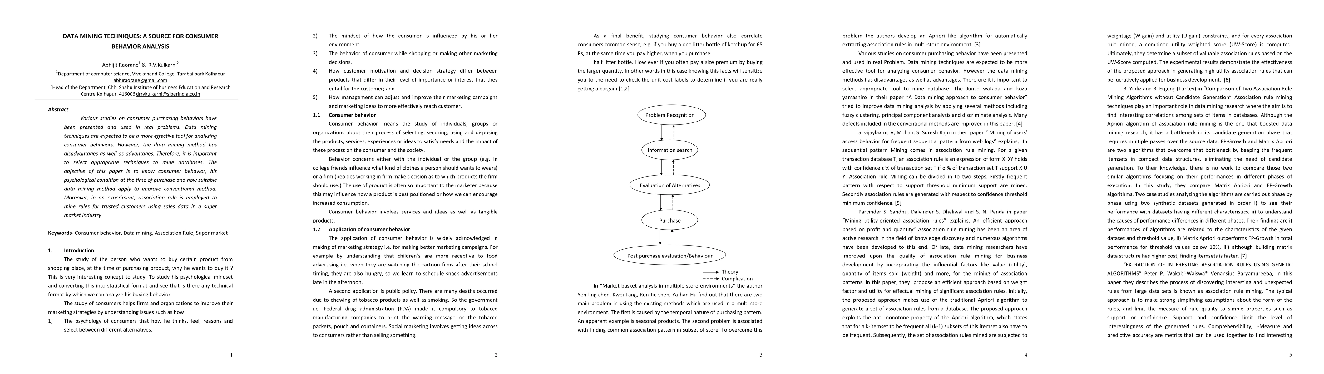 Various studies on consumer purchasing behaviors have been presented and used in real problems. Data mining techniques are expected to be a more effective tool for analyzing consumer behaviors. However, the data mining method has disadvantages as well as advantages. Therefore, it is important to select appropriate techniques to mine databases. The objective of this paper is to know consumer behavior, his psychological condition at the time of purchase and how suitable data mining method apply to improve conventional method. Moreover, in an experiment, association rule is employed to mine rules for trusted customers using sales data in a super market industry