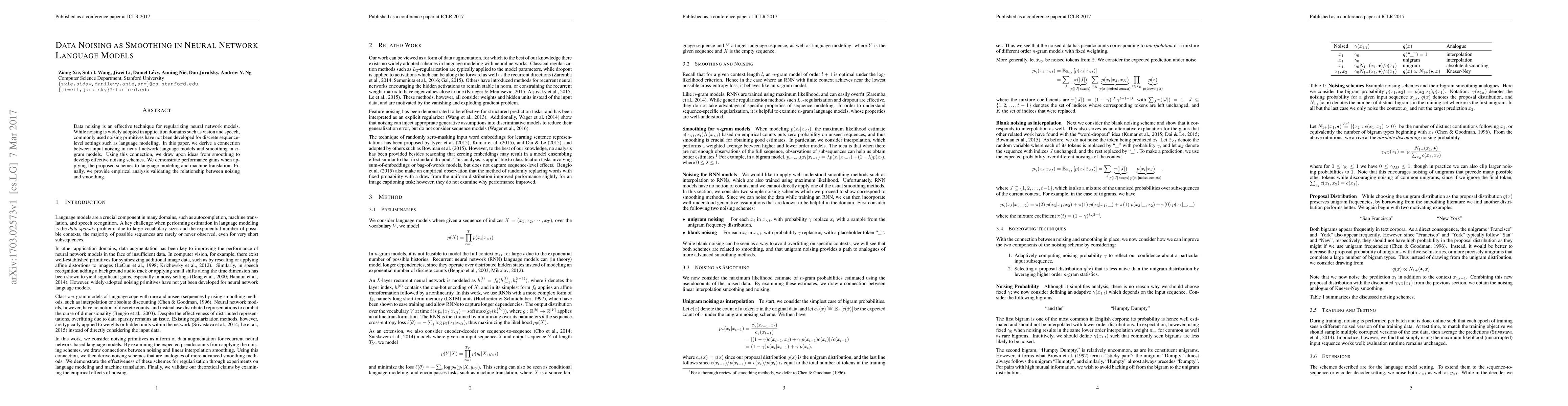 This paper connects data noising in neural network language models to smoothing in $n$-gram models, developing effective noising schemes for sequence-level tasks. The proposed methods show performance improvements in language modeling and machine translation, with empirical analysis supporting the theoretical relationship.