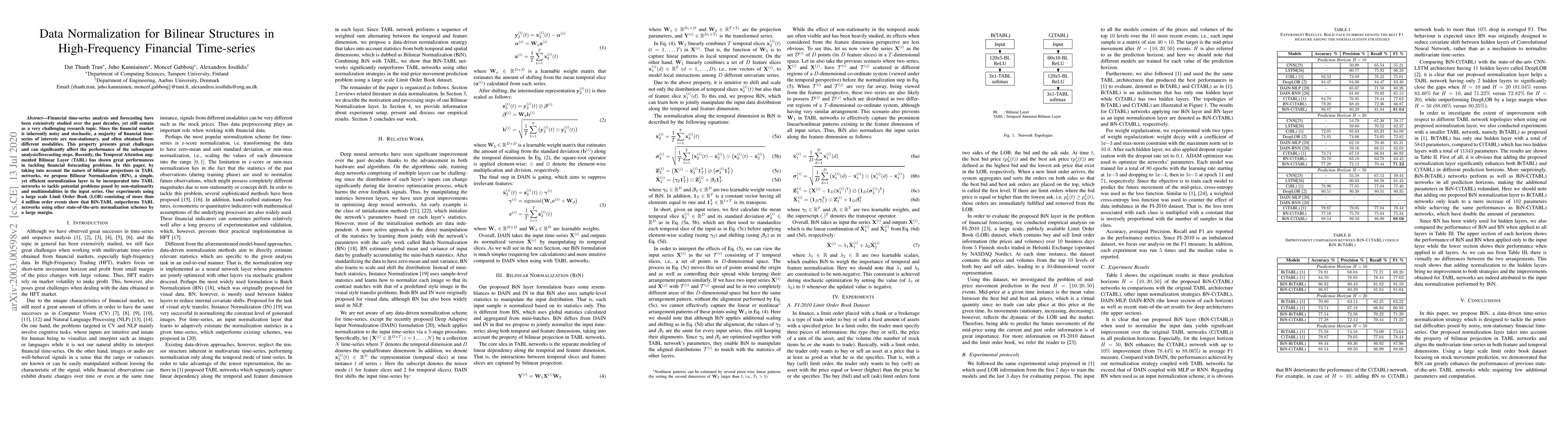 This paper proposes Bilinear Normalization (BiN) to enhance the performance of Temporal Attention augmented Bilinear Layer (TABL) networks in high-frequency financial time-series forecasting. BiN addresses non-stationarity and multimodalities in financial data, leading to superior forecasting results compared to other state-of-the-art normalization methods, as demonstrated on a large-scale Limit Order Book dataset.